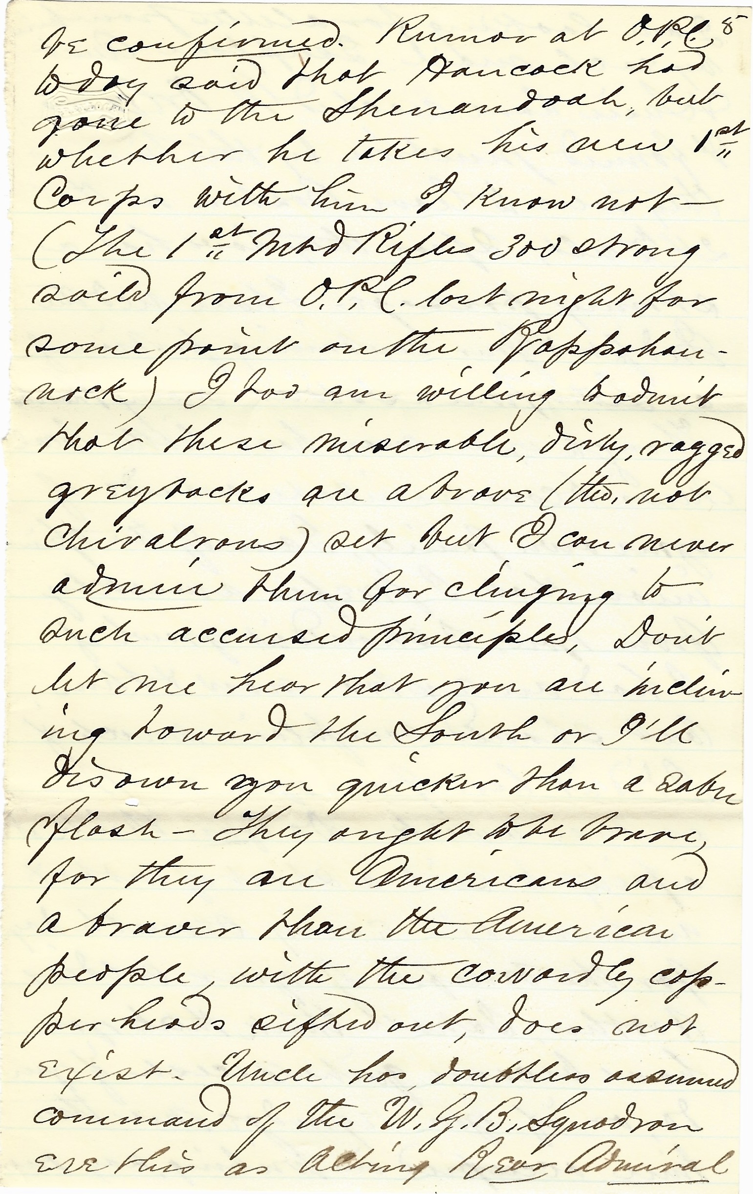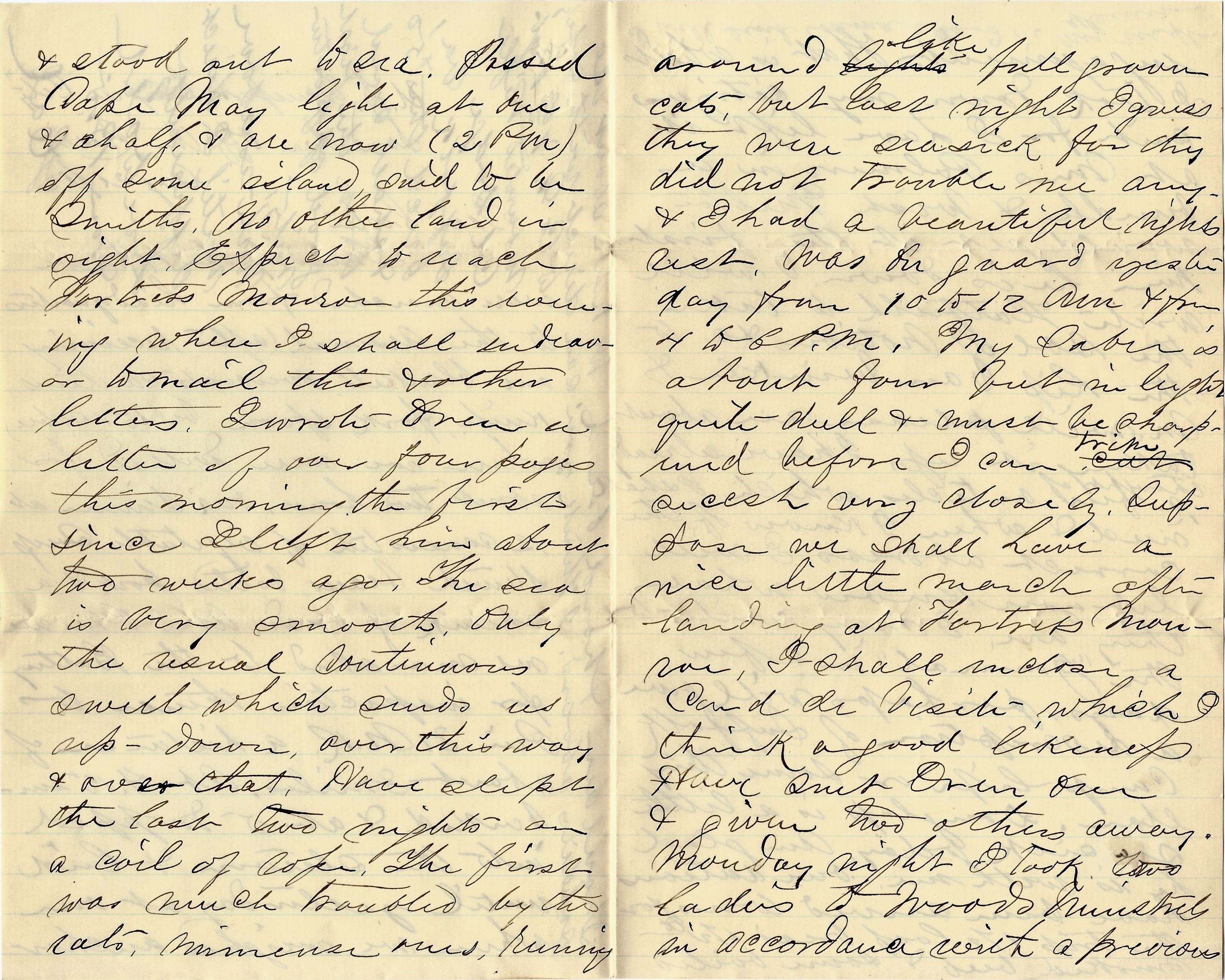 The sea is very smooth—only the usual continuous swell which sends up–down, over this way and that. Have slept the last two nights on a coil of rope. The first was much troubled by the rats—immense ones—running around like full grown cats. But last night I guess they were seasick for they did not trouble me any & I had a beautiful night’s rest. Was on guard yesterday from 10 to 12 a.m. & from 4 to 6 p.m. My saber is about four feet in length—quite dull & must be sharpened before I can trim secesh very closely. Suppose we shall have a nice little march after landing at Fortress Monroe.