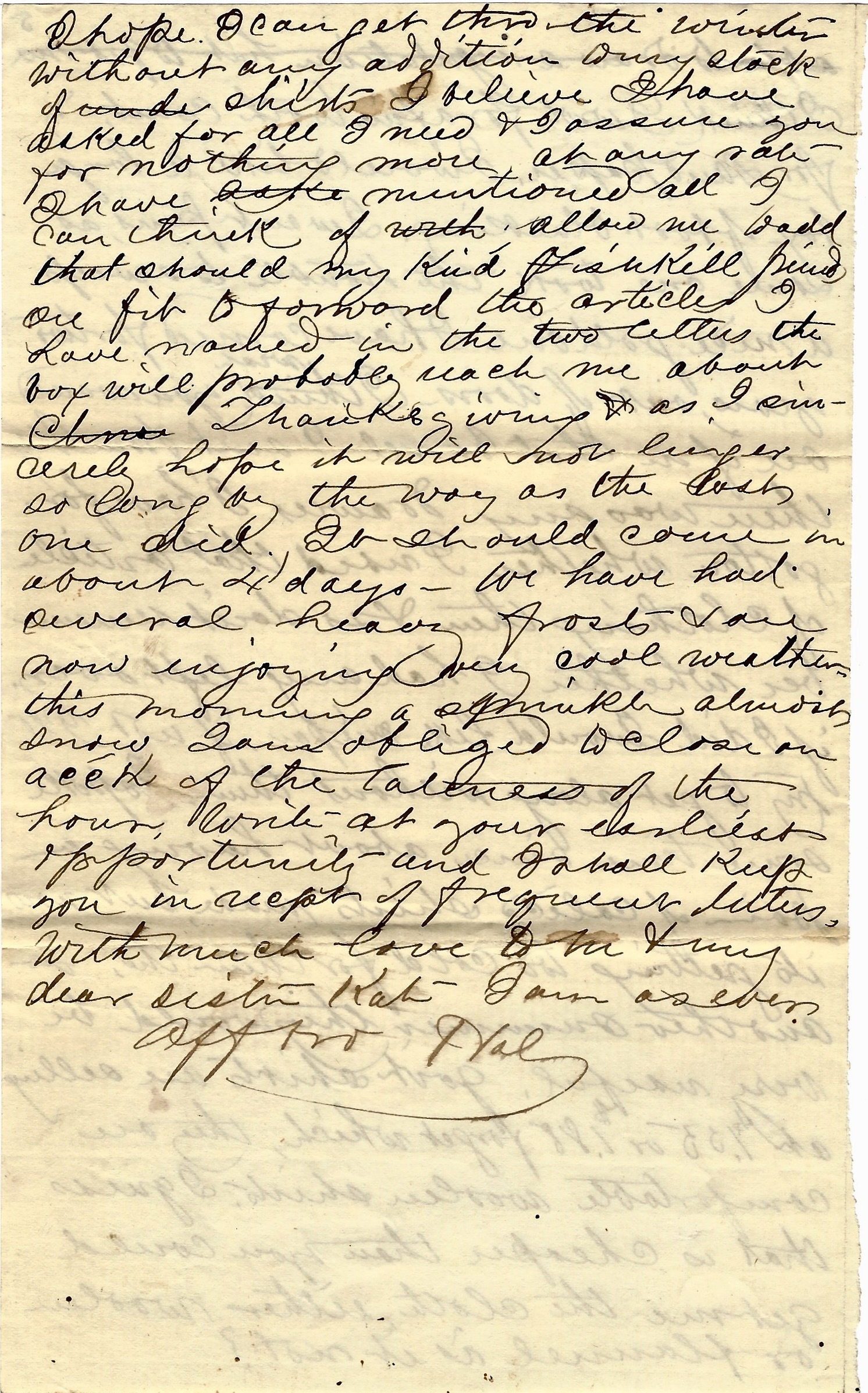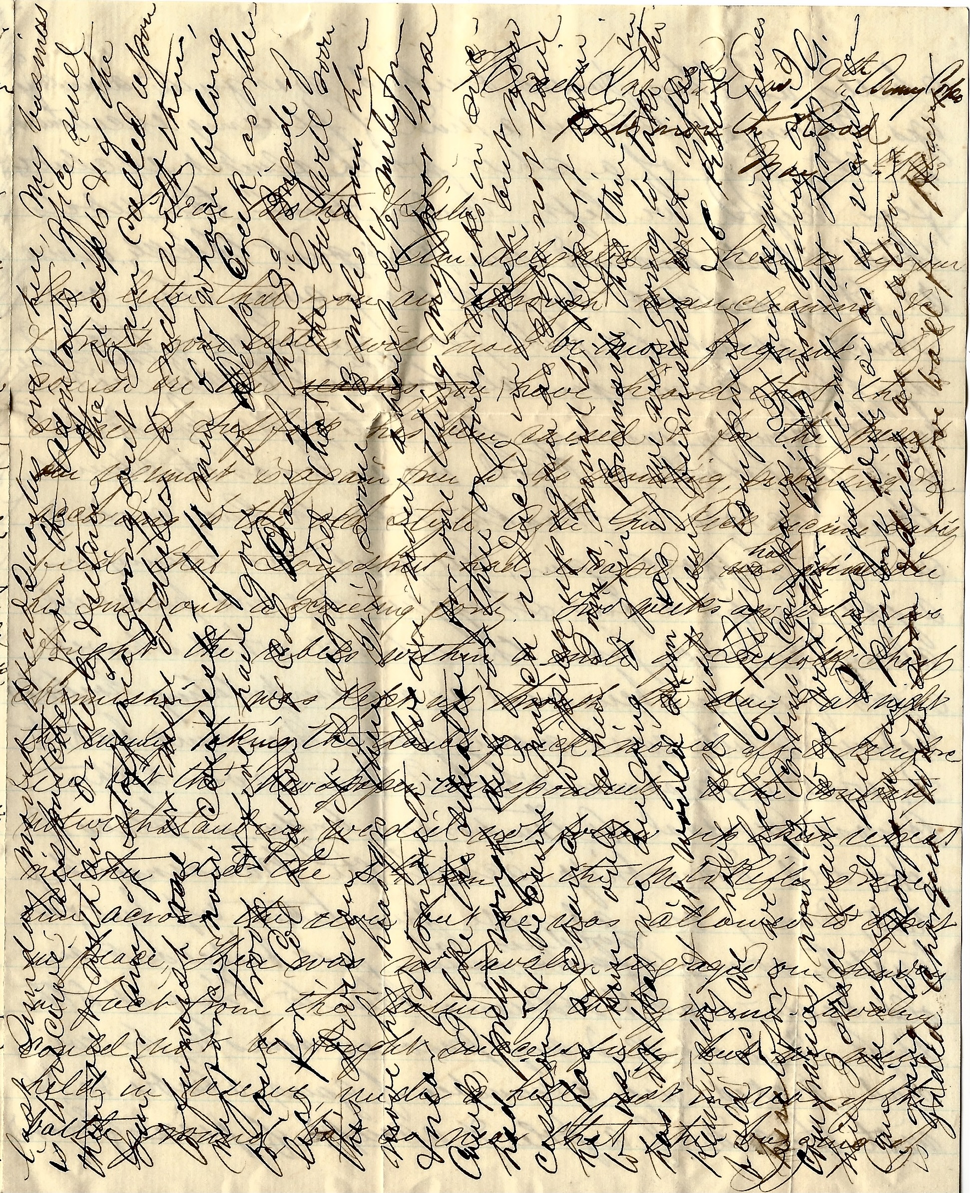 I have got my cow from Mr. Curran. I had to pay 25 dollars for her. I got the clothes. Your father got the things and looked them all over. There was two or three little things in the pockets. I got the vile. You wanted me to tell you all that I got. I got four blankets. This makes nine that I have now, and two shirts, one pair of pants…