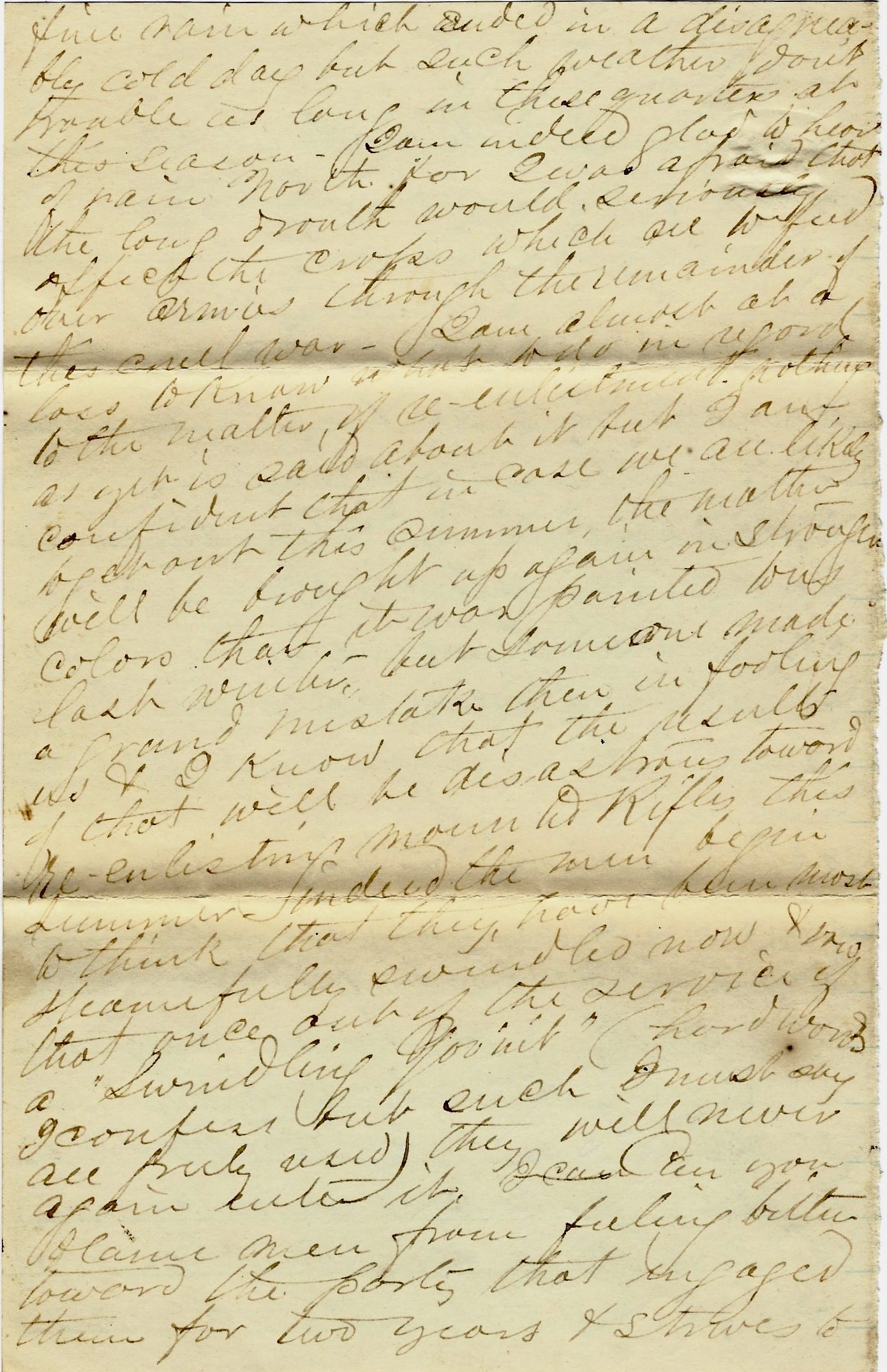 There is hardly any sowing done here yet—the land is so wet. I had a letter from Gerry Martin. He was then in Missouri. Where he is now, I don’t know for they marched from there. His wife had news from Fond-du-lac that her father was very sick so she went with her children adn Mrs. Perry Clark yesterday to Sparta and today she will be in Fond-du-lac so we are all alone now. Your family are all well and so are all the neighbors. Your mother sends her love to you and Dan and John. If you see him, tell him that I got one letter from him and sent two. Your mother says that when you and Dan come home, we will have the big pudding—if it can be got anyhow.