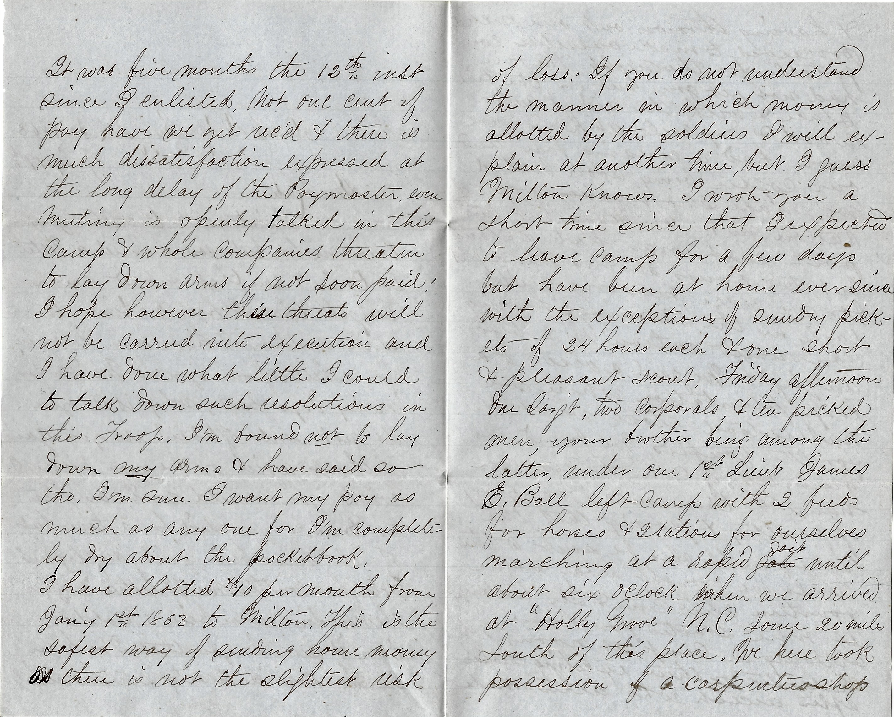 Today I received yours of the 26th. I am on picket today. I have to go on only once in about four weeks. There are two very important things transpiring today. One is the inauguration of Old Abe [but] however important that event may be to the country, there is another that is full as important to the members of the regiment individually and that is that we are receiving four months pay. And for one, I can say that it comes in time of need.