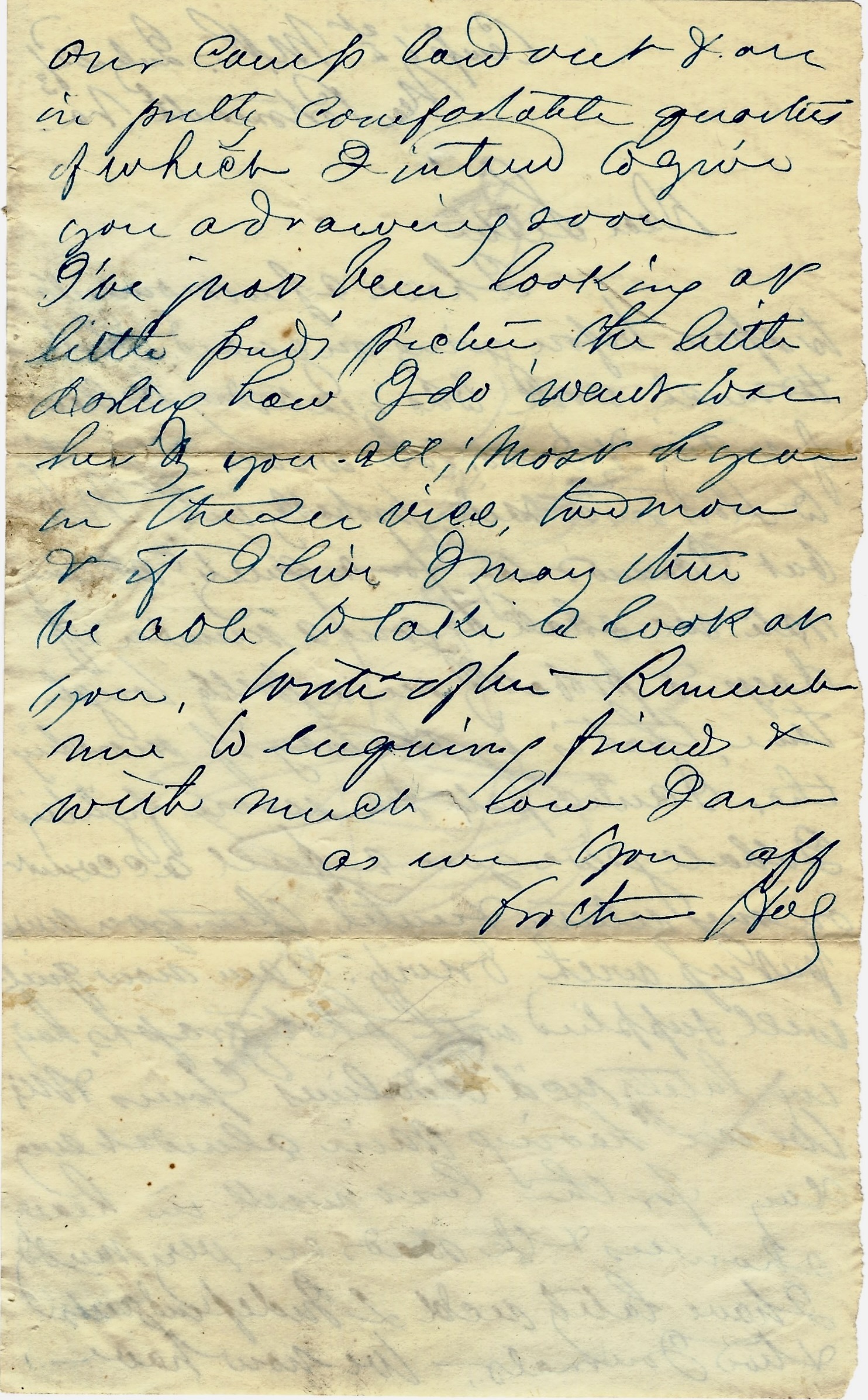 I am enjoying usual good health though tonight am pretty tired & as Tattoo has just blown, I shall not have time to write a letter tonight. I shall hope to hear from you oftener than of late. Do not worry for me if you do not regularly. I’ll write as often as I can but for many days now & then I’m away or too busy to write.