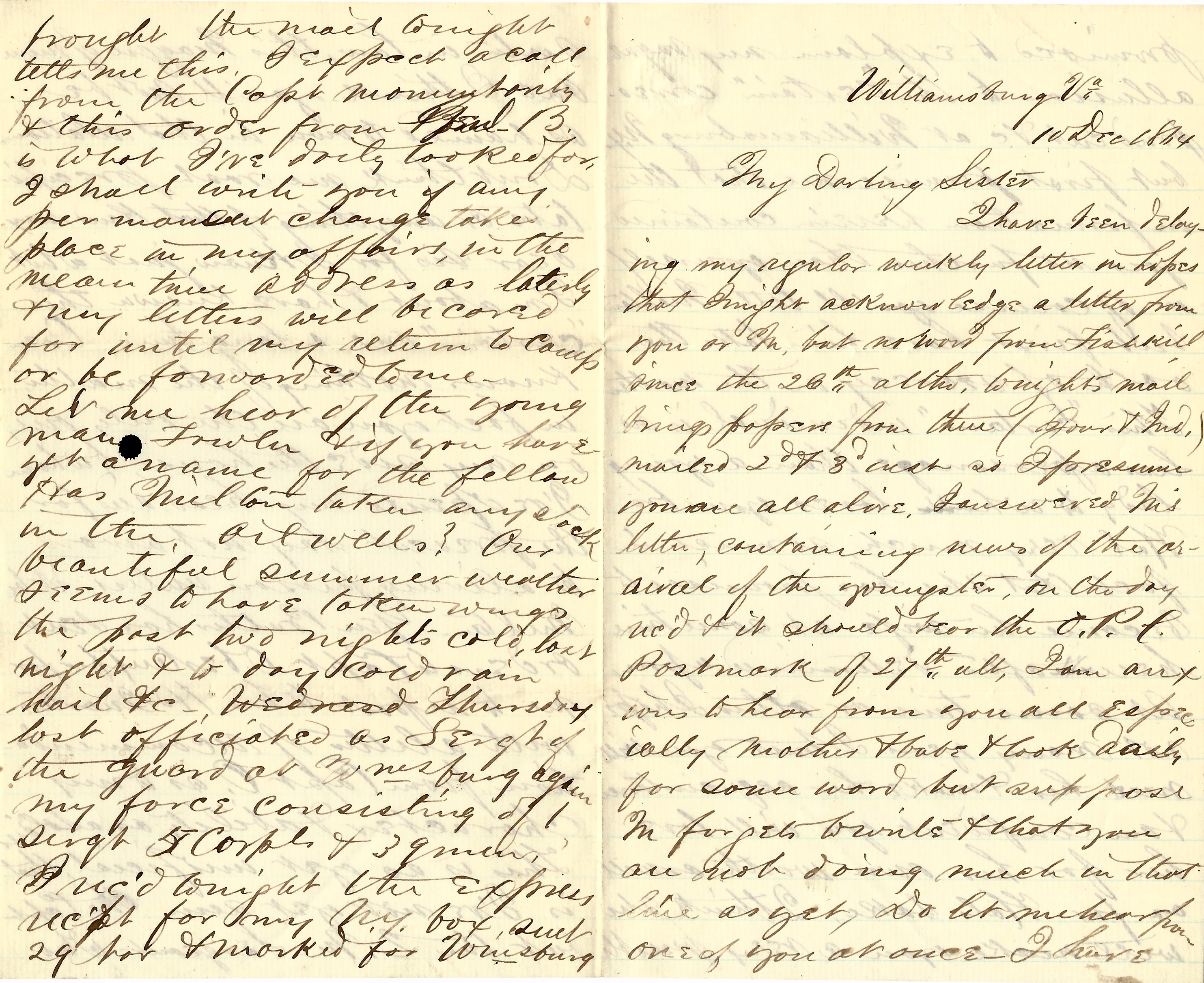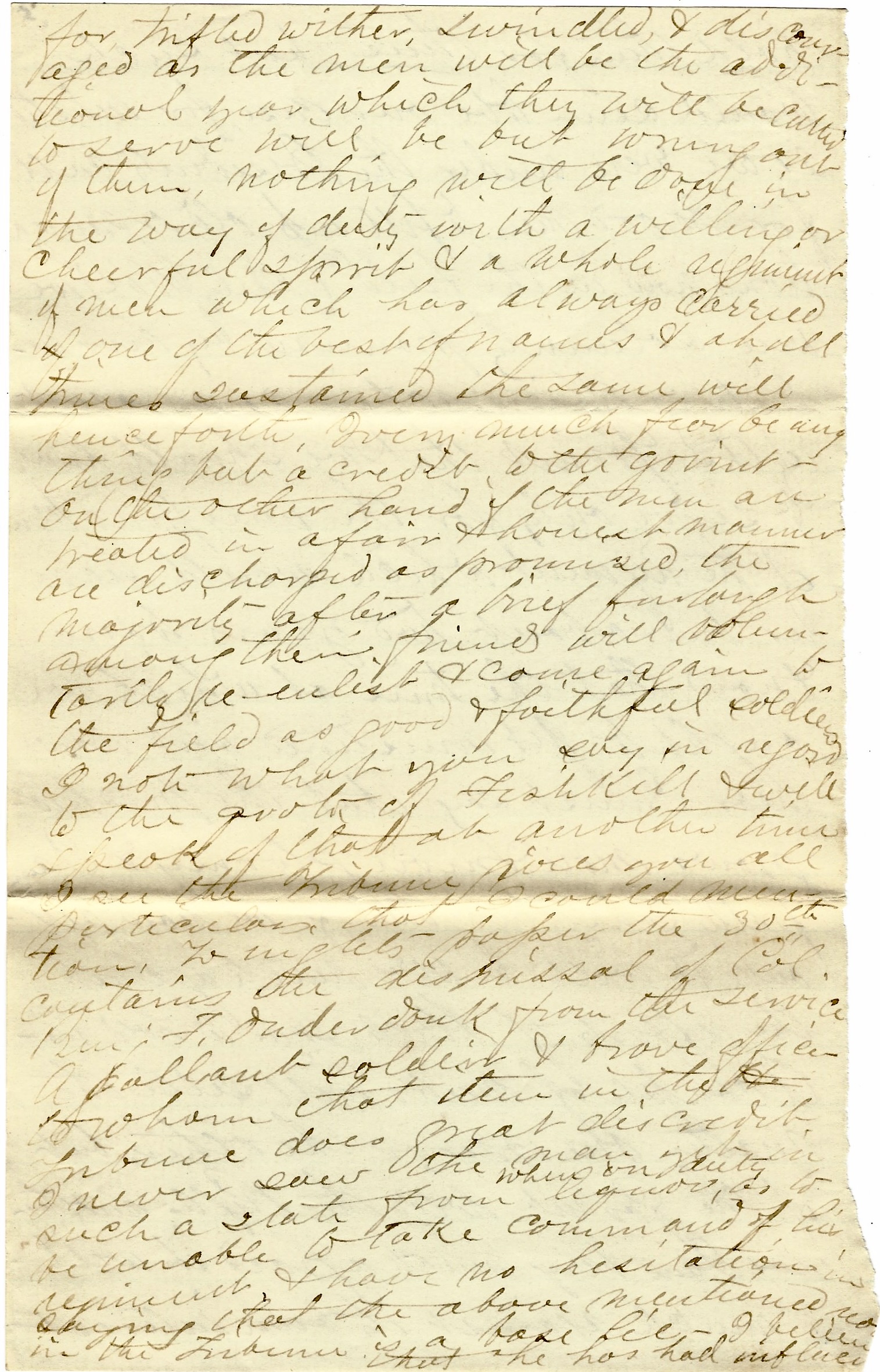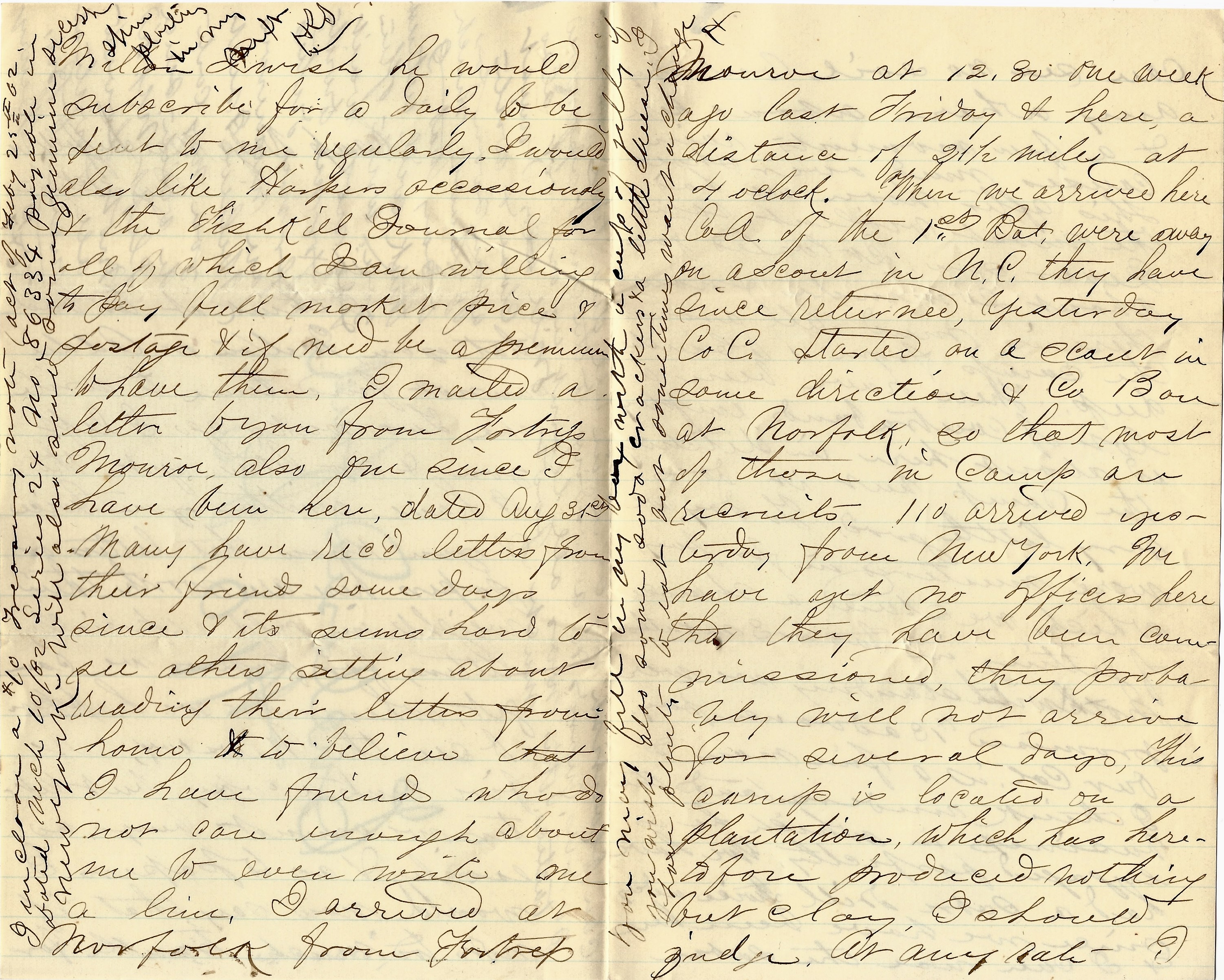 I think it too bad that you, Milton, or Addie cannot find time to write me. Two weeks ago I left you & no letter yet though I have written you twice. You know that letters or papers here are worth their weight in gold—especially letters, for papers we can get whenever we happen to see the news boy at 5 cents a copy. But letters we cannot buy so easily & as to papers, I would now say that if not too much trouble for Milton, I wish he would subscribe for a daily to be sent to me regularly. I would also like Harpers occasionally and the Fishkill Journal for all of which I am willing to pay full market price & postage & if need be a premium to have them. I mailed a letter to you from Fortress Monroe, also once since I have been here, dated August 31st. Many have received letters from their friends some days since & it seems hard to see others sitting around about reading their letters from home & to believe that I have friends who do not care enough about me to even write me a line.