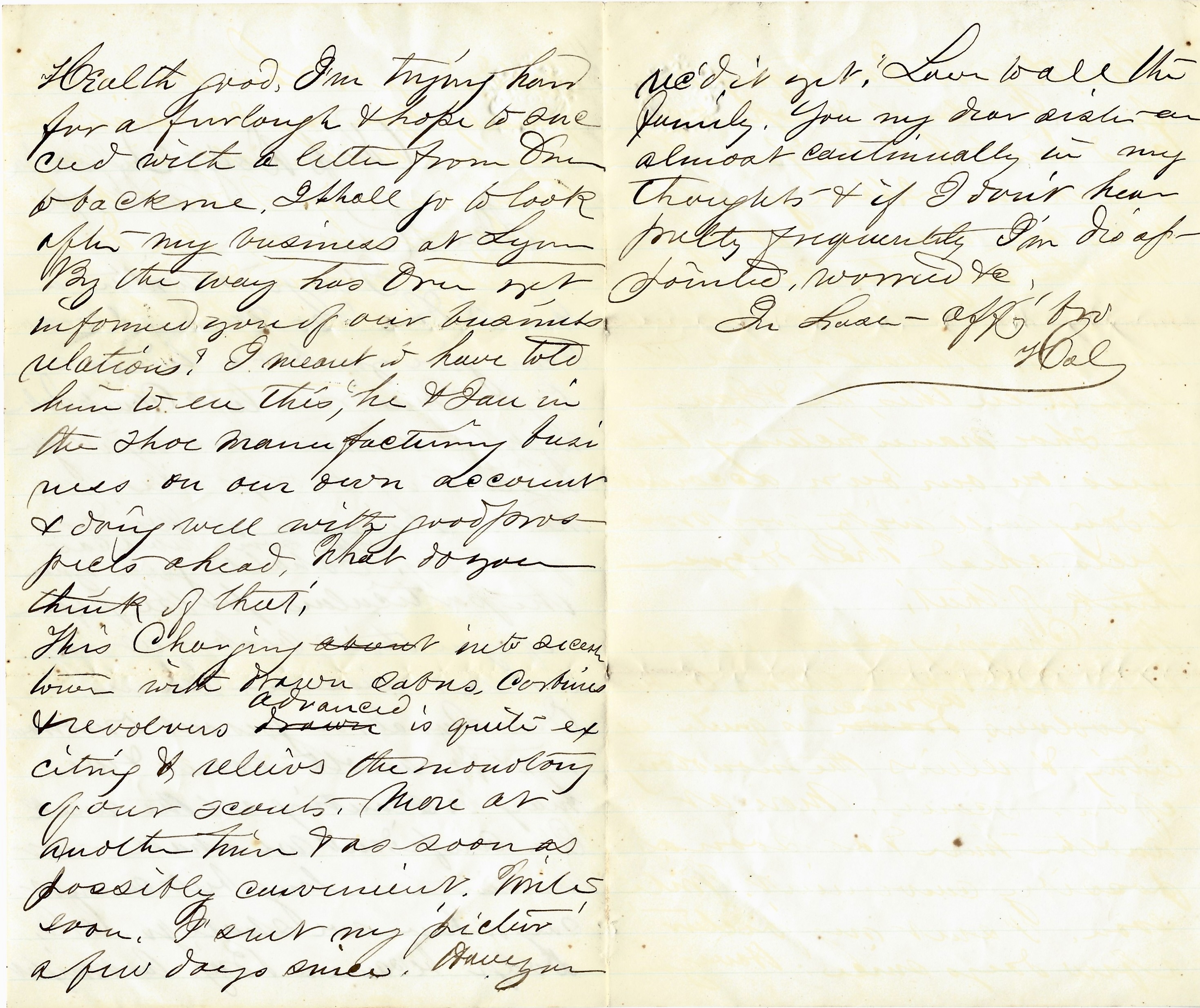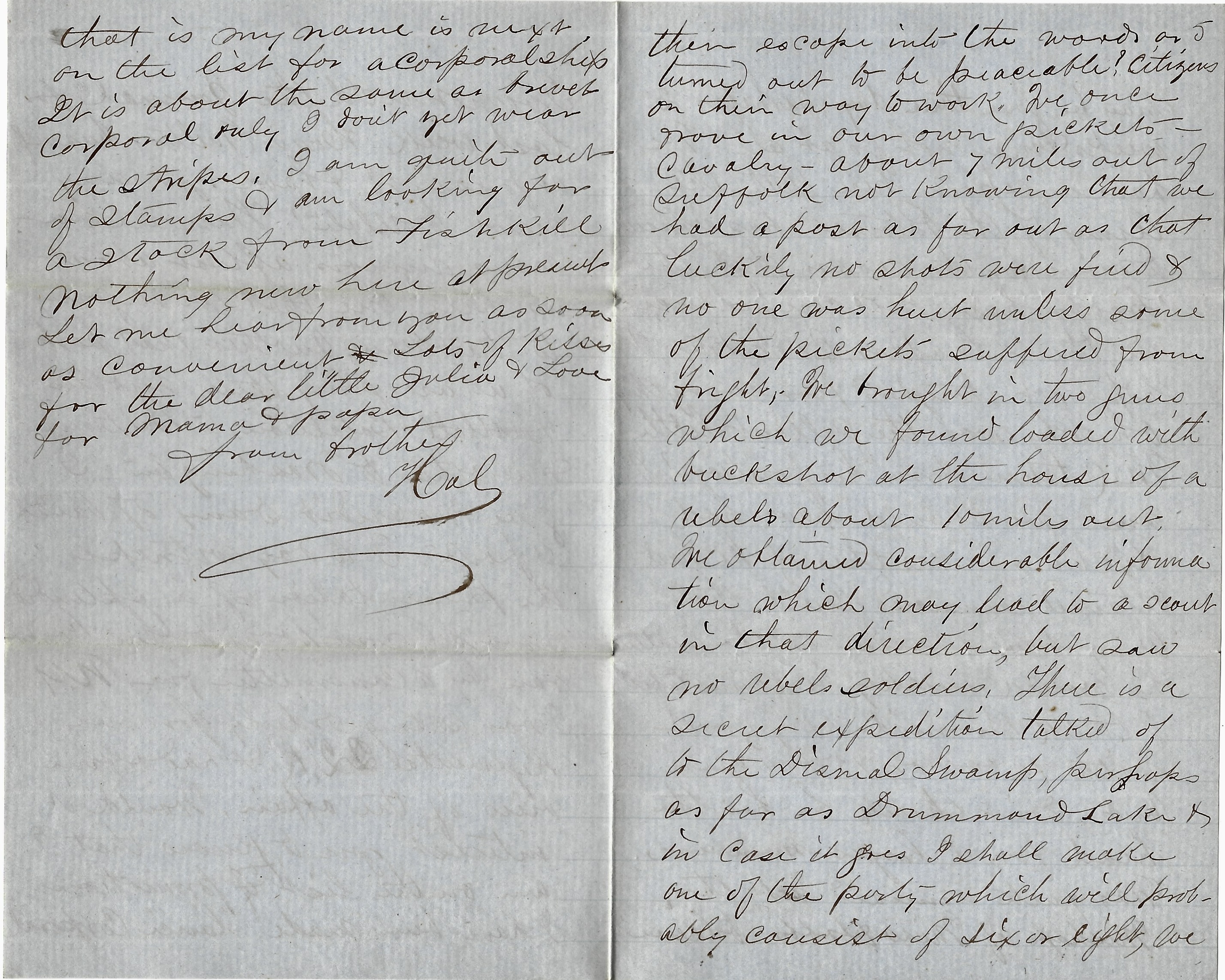 We returned home without a fight though I think most of the men were sadly disappointed. At one time a squad of rebels (probably guerrillas) were seen advancing toward us, but at sight of one of our howitzers pointed toward them they sprang into the bushes about a mile off & were not again seen. We have not yet had our carbines given to us & may have large revolvers furnished instead. I have a carbine which I managed to get & with my little revolver for close work, I am not afraid to stand my chance, We may yet be called out to fight here or near here & shall no doubt make and advance to Richmond via Petersburg in due time. Richmond is only about 80 miles distant. If you have one of those agriculturist maps, you can see just where we are & where I have been. Suffolk swarms with soldiers. There must be 20,000 or 25,000 here in this vicinity. I have much more to write but time now will not permit. Write soon and I will drop a line again in a few days. Love to all from brother, — Hal