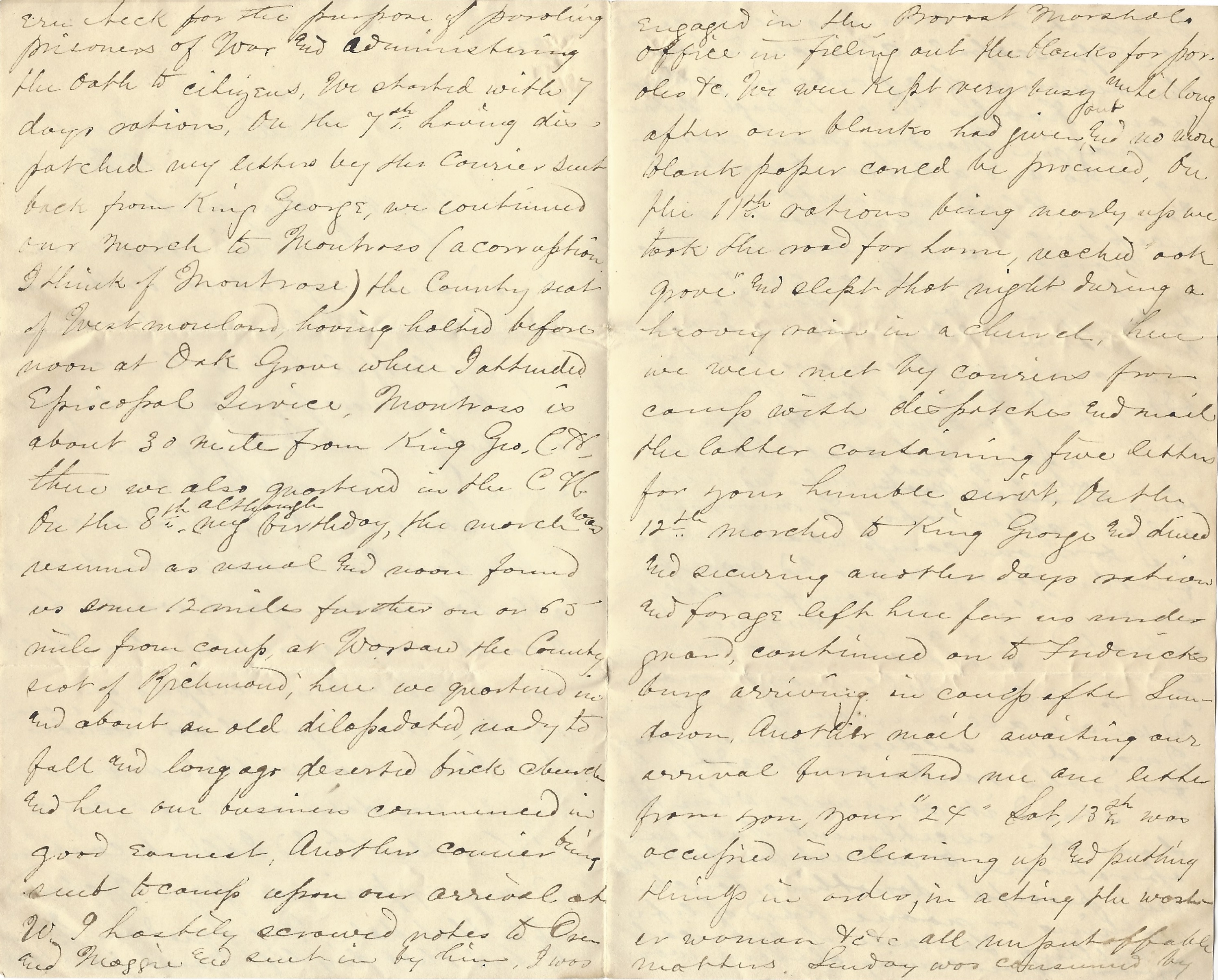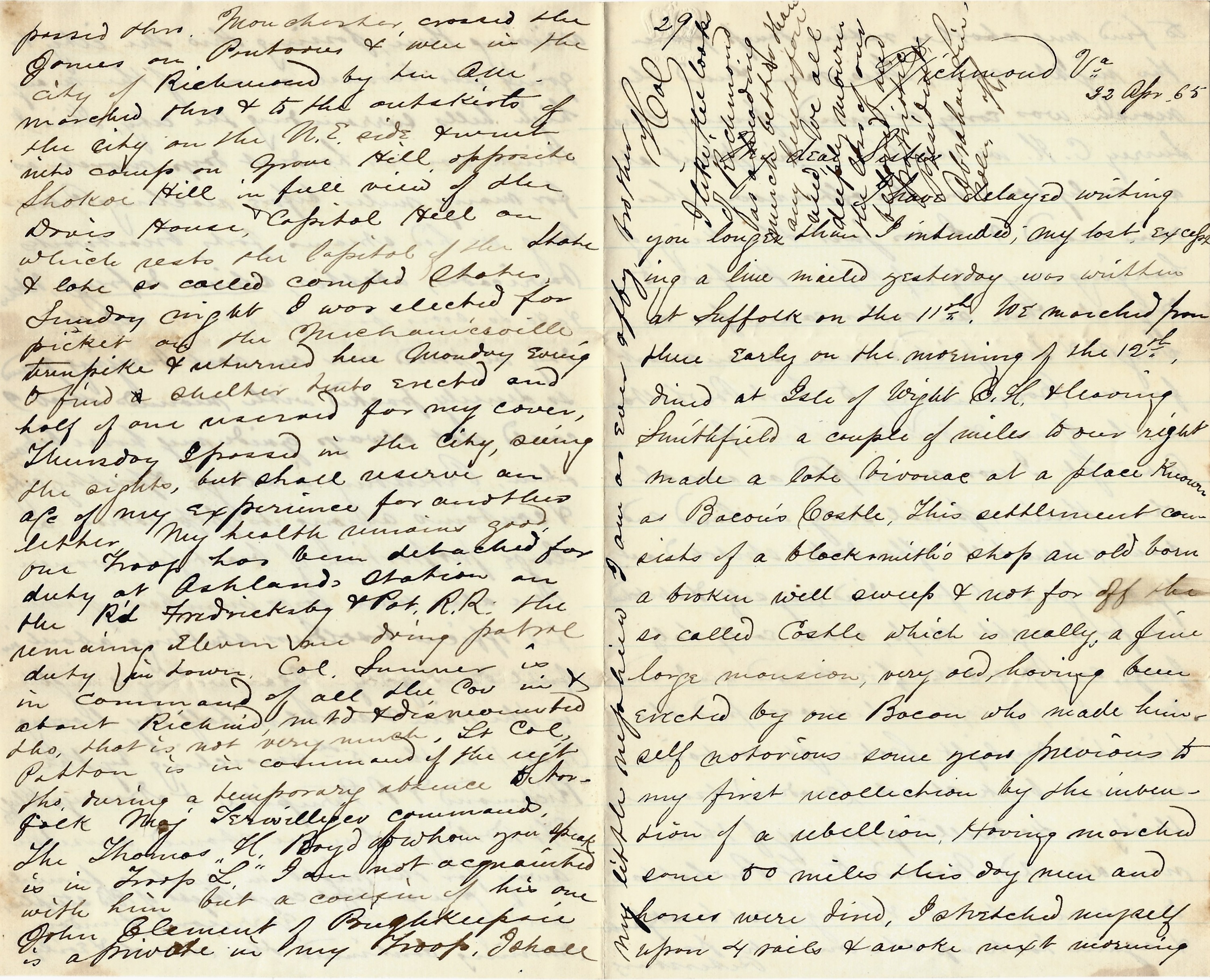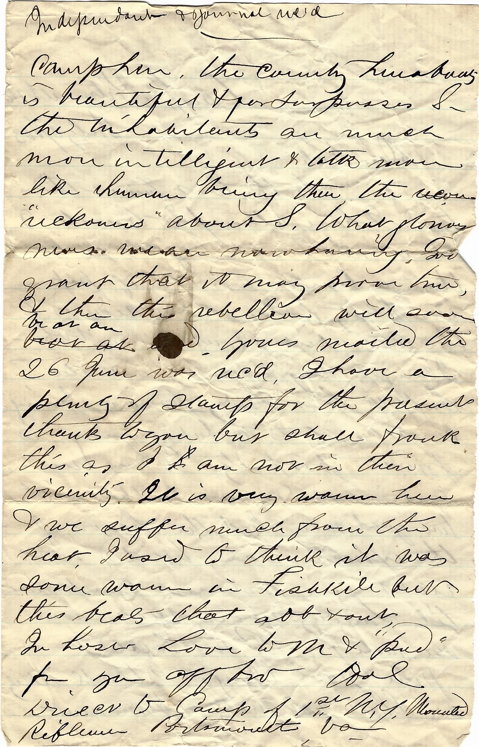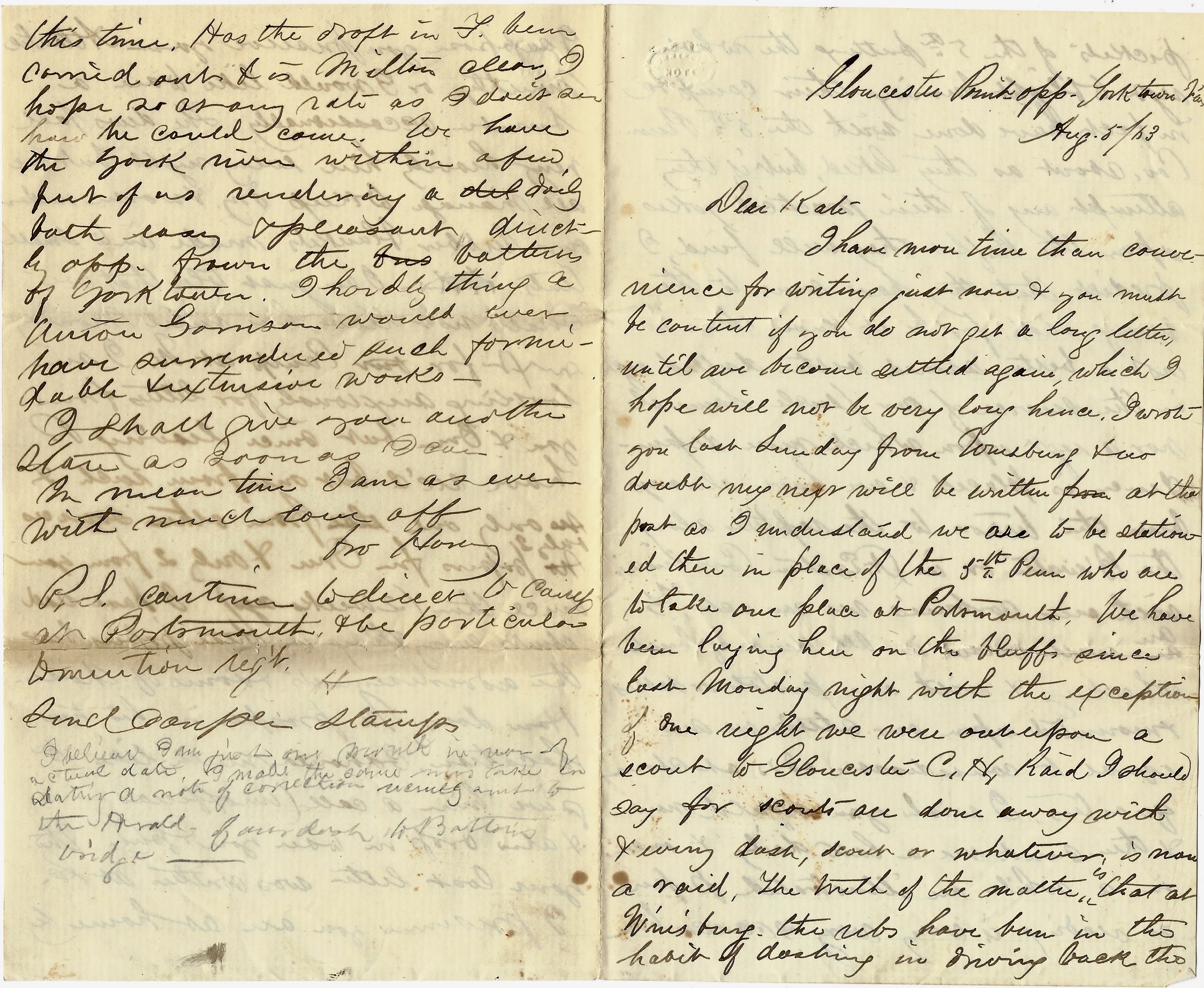 I should be at prayer meeting tonight at our chaplain’s but I wanted to write you & Oren a few lines. Report says the regiment is to leave camp tonight or tomorrow & be out for several days. The Rebels are no doubt in force near here under Roger A. Pryor but I’m confident if we meet them we shall give a good account of ourselves. We shall have [Michael] Corcoran’s fighting Irishmen [69th NY Infantry] along with plenty of artillery. The rascals are worrying our pickets constantly and must be driven across the Blackwater. Several thousand troops were out yesterday and had some fighting but returned last night.