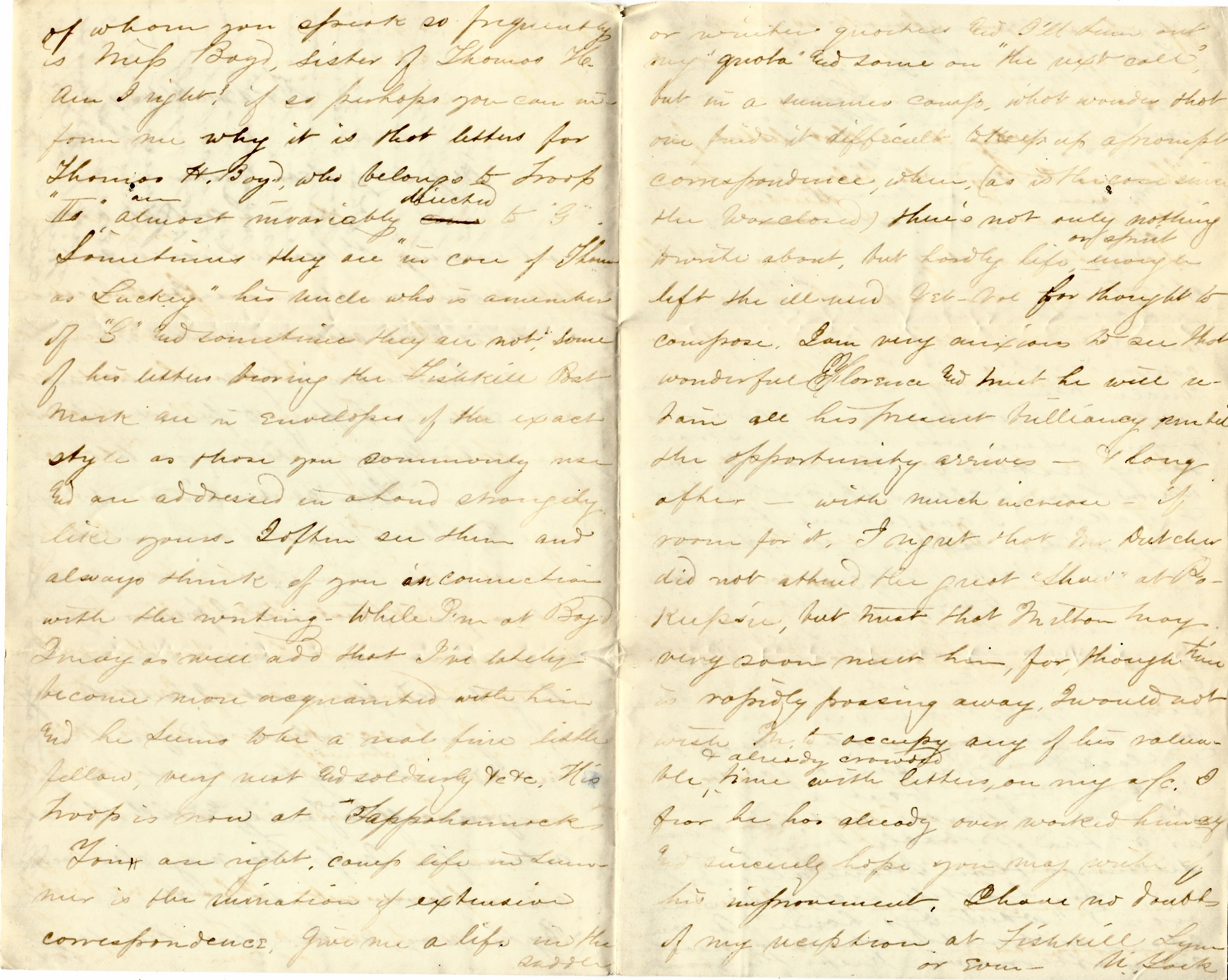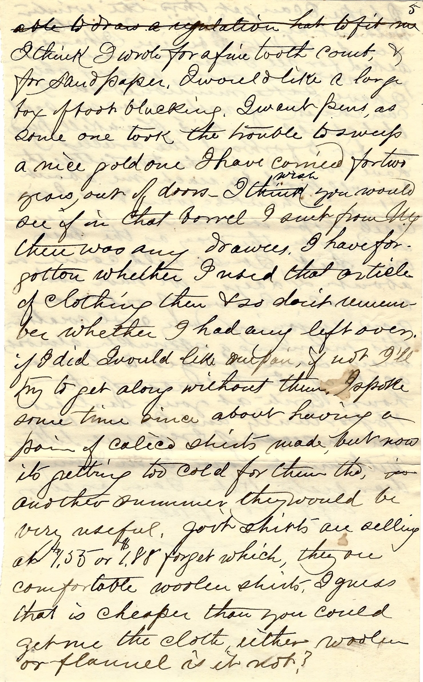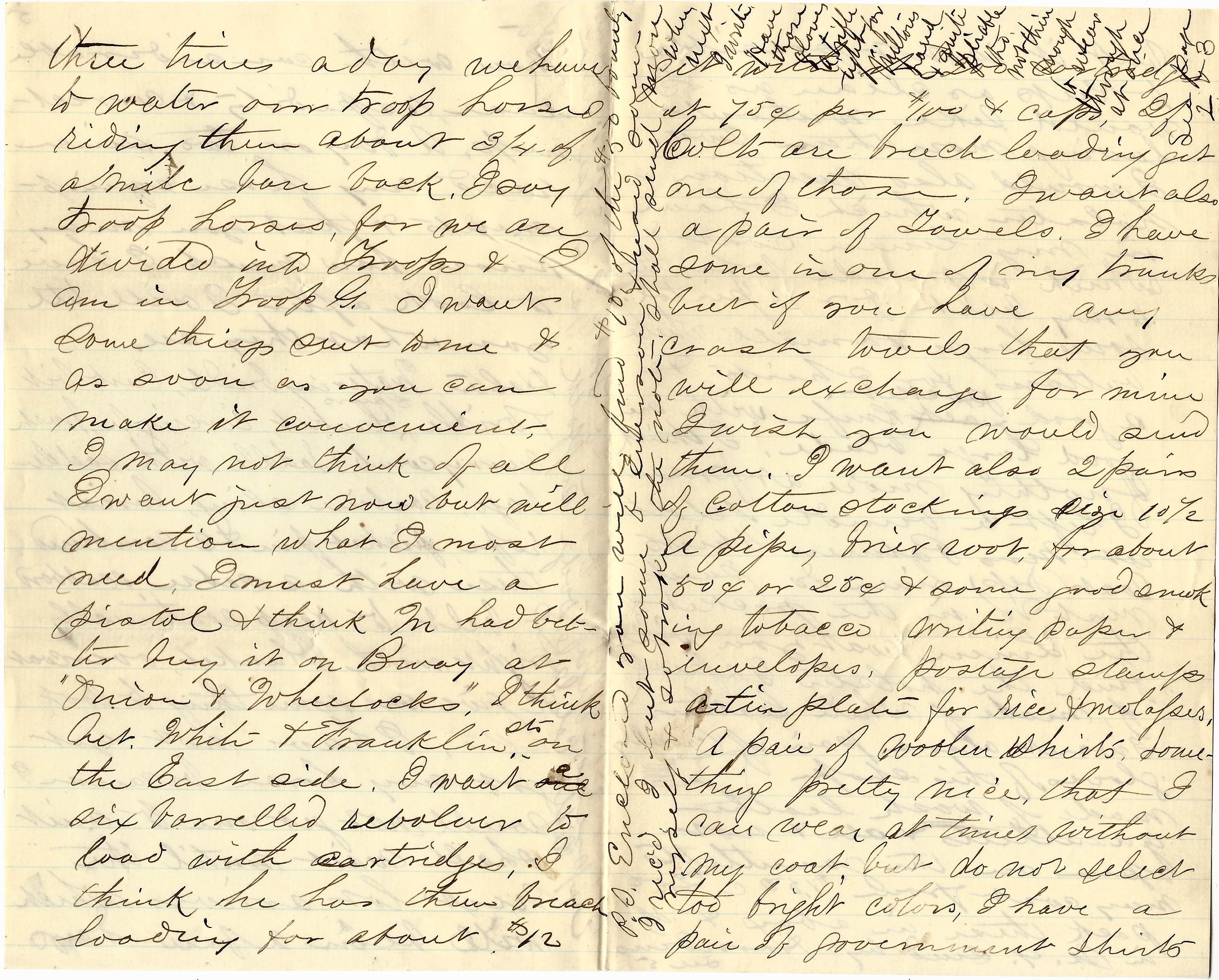 Three times a day we have to water our troop horses, riding them about 3.4 of a mile bareback. I say troop horses for we are divided into Troops ad I am in Troop G. I want some things sent to me & as soon as you can make it convenient. I may not think of all I want just now but will mention what I most need. I must have a pistol & think Milton had better buy it on Broadway at “Union & Wheelocks,” I think between White and Franklin Streets on the East side. I want a six-barrelled revolver to load with cartridges. I think he has them breach-loading for about $12. Get with it 200 cartridges at 75 cents per $1 & caps. If Colts are breech loading, get one of those. I want also a pair of towels. I have some in one of my trunks but if you have any crash towels that you will exchange for mine, I wish you would send them. I want also two pairs of cotton stockings, size 1.5, a pipe, brier root, for about 50 cents or 25 cents, and soe good smoking tobacco, writing paper, and envelopes, postage stamps, a tin plate for rice & molasses, a pair of woolen shirts—something pretty nice that I can wear at times without my coat, but do not select too bright colors. I have a pair of government shirts but it is not possible to keep as clean as I would like without having more than two. I would also mention a holster which I have in my linen coat & which is made to fasten to my belt for a pistol. Some large & small white buttons for shirts, &c., a good pocket knife with one good large blade. I think of nothing more at present.