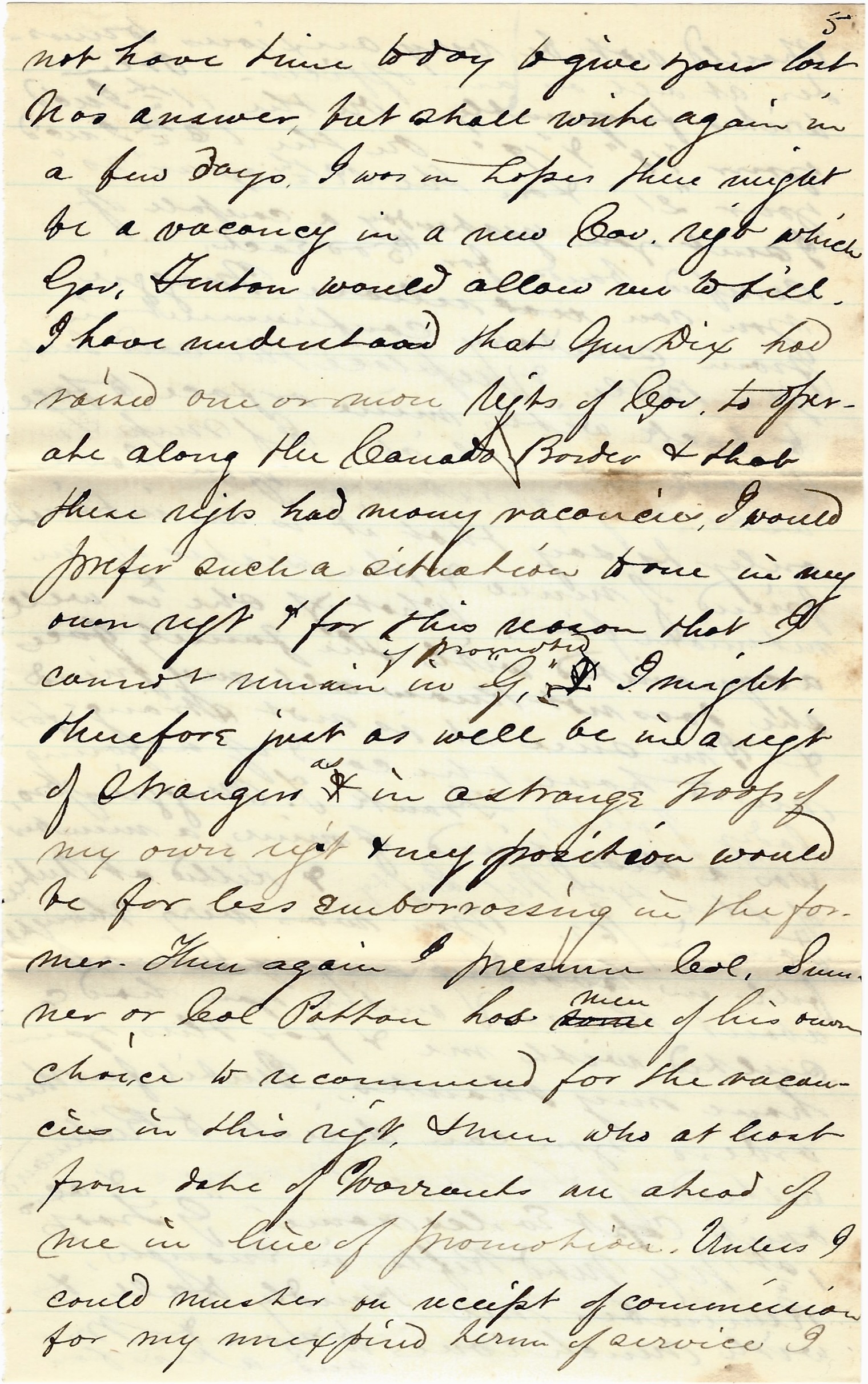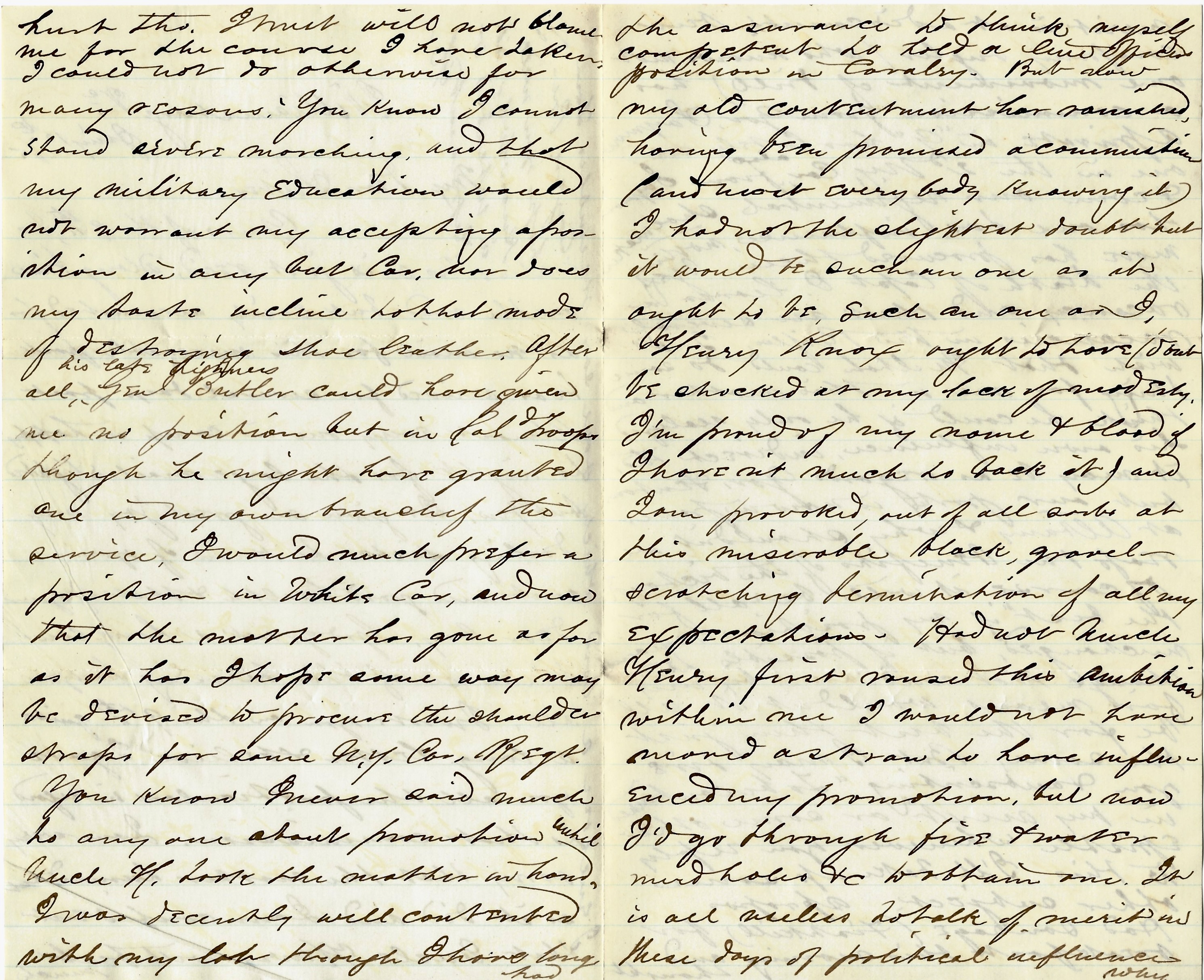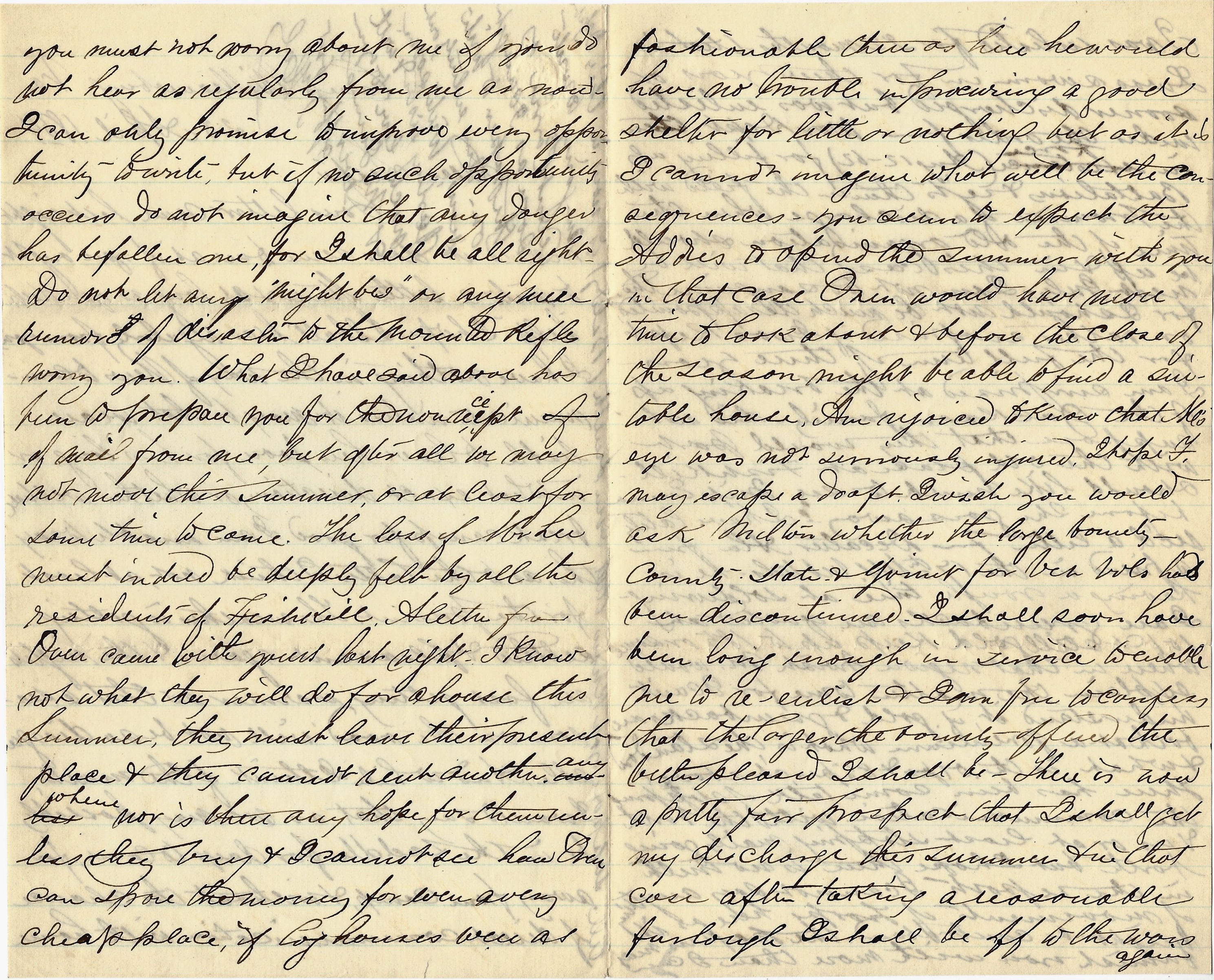 Three times a day we have to water our troop horses, riding them about 3.4 of a mile bareback. I say troop horses for we are divided into Troops ad I am in Troop G. I want some things sent to me & as soon as you can make it convenient. I may not think of all I want just now but will mention what I most need. I must have a pistol & think Milton had better buy it on Broadway at “Union & Wheelocks,” I think between White and Franklin Streets on the East side. I want a six-barrelled revolver to load with cartridges. I think he has them breach-loading for about $12. Get with it 200 cartridges at 75 cents per $1 & caps. If Colts are breech loading, get one of those. I want also a pair of towels. I have some in one of my trunks but if you have any crash towels that you will exchange for mine, I wish you would send them. I want also two pairs of cotton stockings, size 1.5, a pipe, brier root, for about 50 cents or 25 cents, and soe good smoking tobacco, writing paper, and envelopes, postage stamps, a tin plate for rice & molasses, a pair of woolen shirts—something pretty nice that I can wear at times without my coat, but do not select too bright colors. I have a pair of government shirts but it is not possible to keep as clean as I would like without having more than two. I would also mention a holster which I have in my linen coat & which is made to fasten to my belt for a pistol. Some large & small white buttons for shirts, &c., a good pocket knife with one good large blade. I think of nothing more at present.
