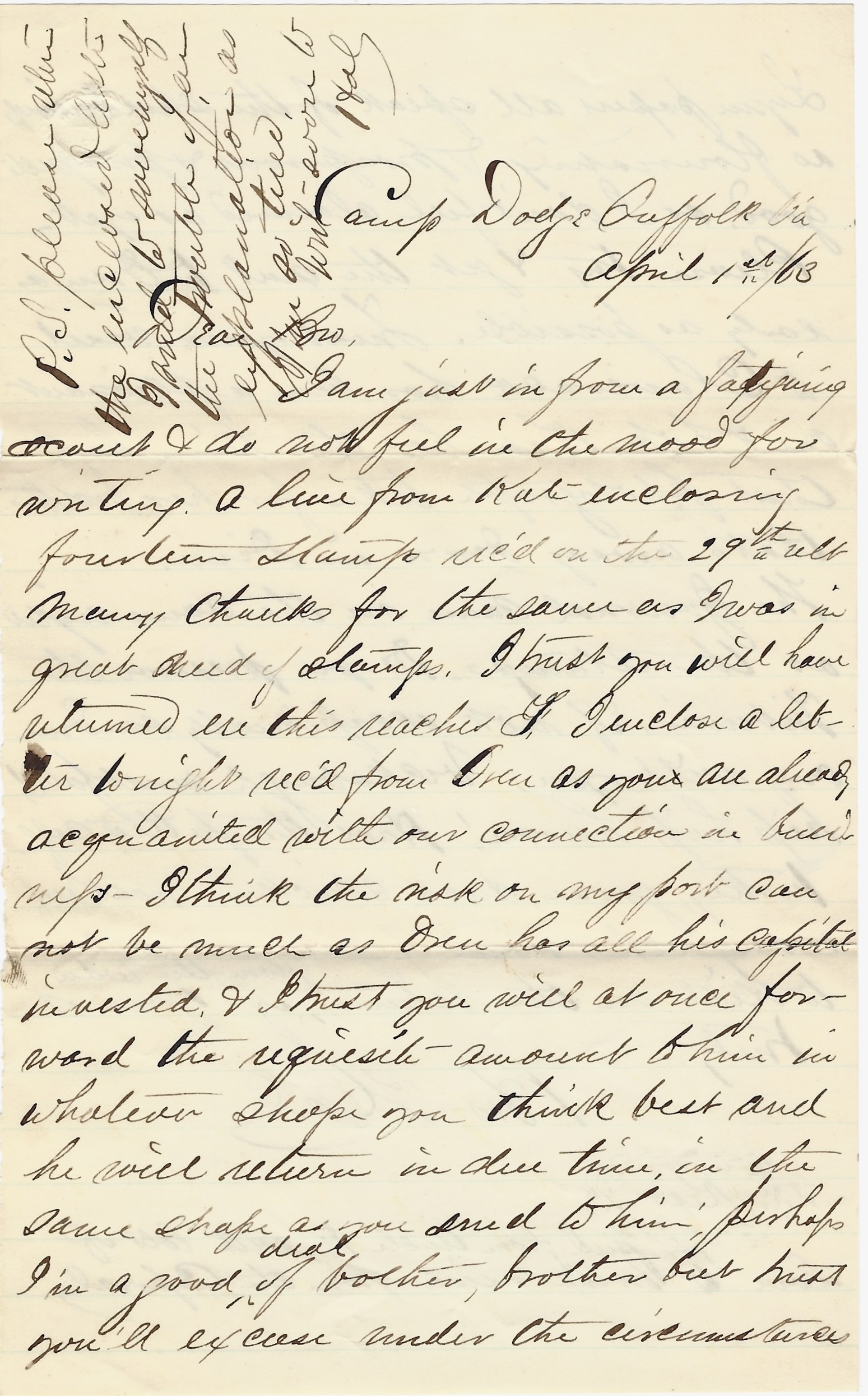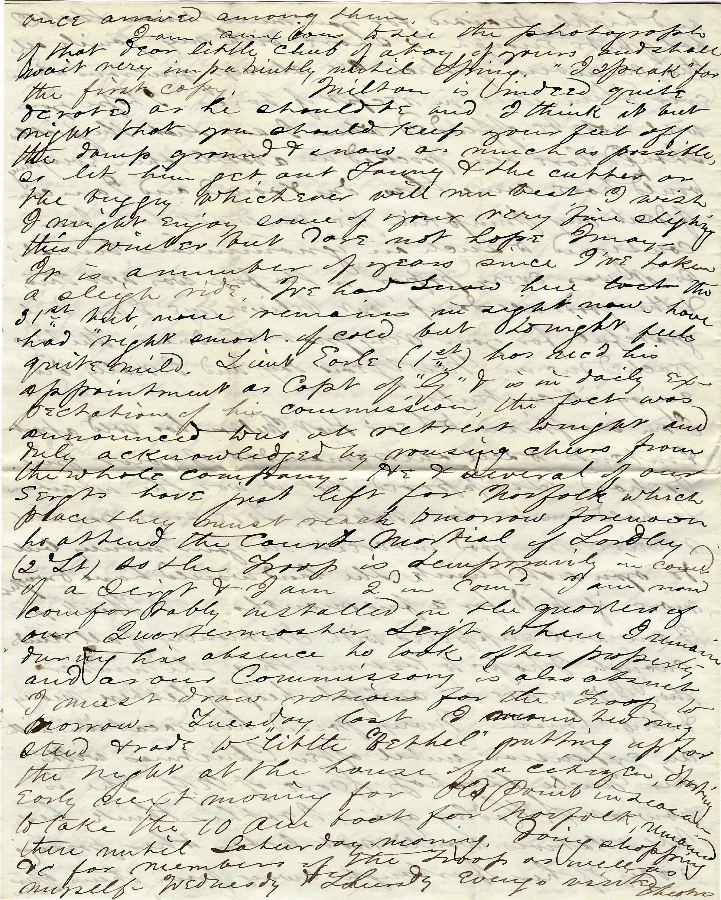 We have a foot drill and sabre exercise once a day and mounted drill twice. I have been on mounted guard once from Saturday morning to Sunday morning last. Have not been yet on picket but am liable to be at any time. Our troop is detailed for guard as we have two picket posts to fill, one on the railroad near camp and another on the Dismal Swamp Canal about 1.25 miles east of here in the direction of Norfolk. I do not consider either of them dangerous posts. We are by no means near Manassas but many miles south and east of Richmond. In fact, but 3 or 5 miles from the edge of the Dismal Swamp & by the highway only 12 or 15 miles from the North Carolina State line. I believe I wrote you of the prisoners brought in by a scouting party a few days since from near Elizabeth City, N. C. Reams on their way to join a rebel camp on the Blackwater River south and west of here. Gen. Mansfield is out here quite often. His headquarters are at Suffolk at the Central Hotel. Max Weber has his headquarters on the same street but at a splendid private dwelling.