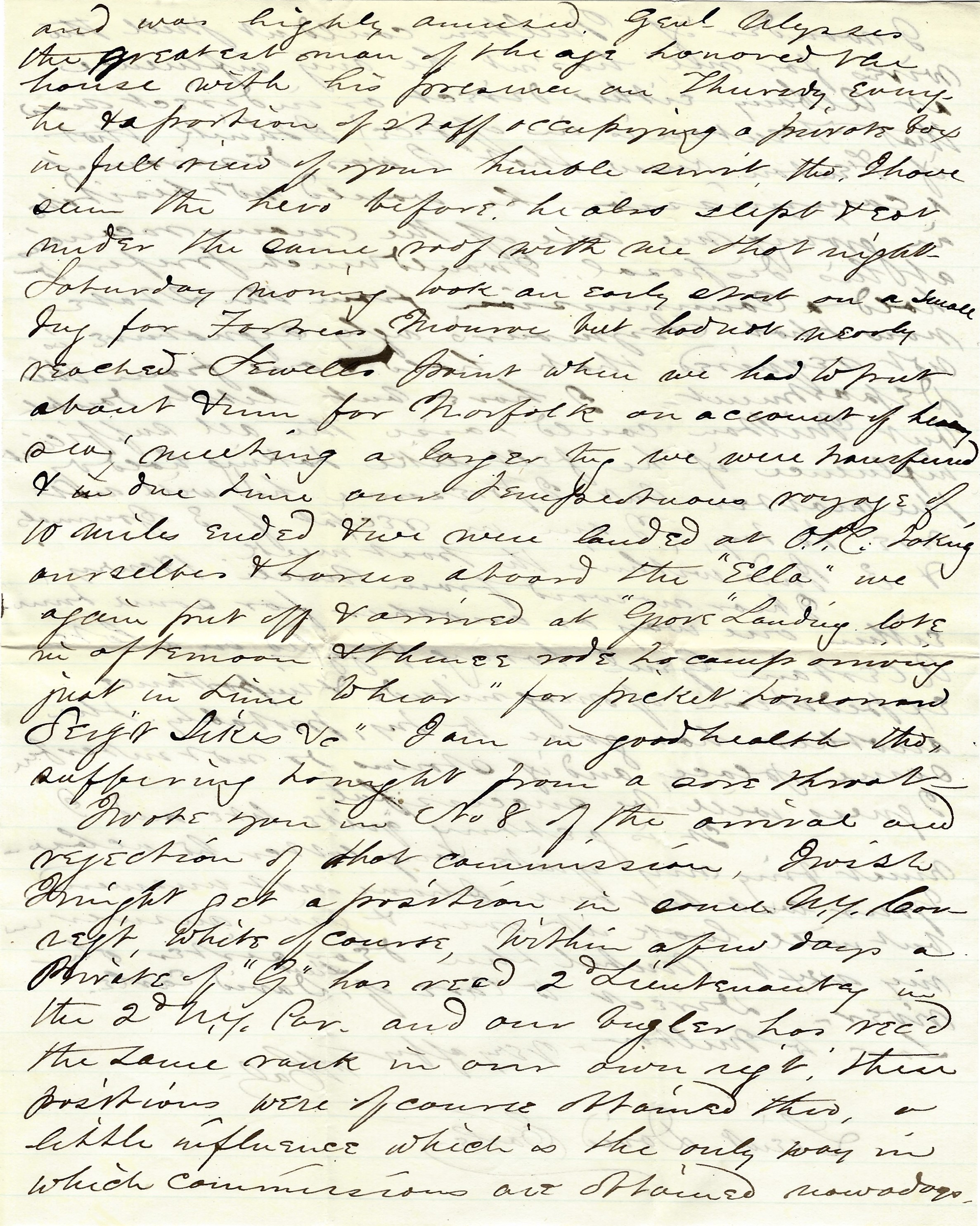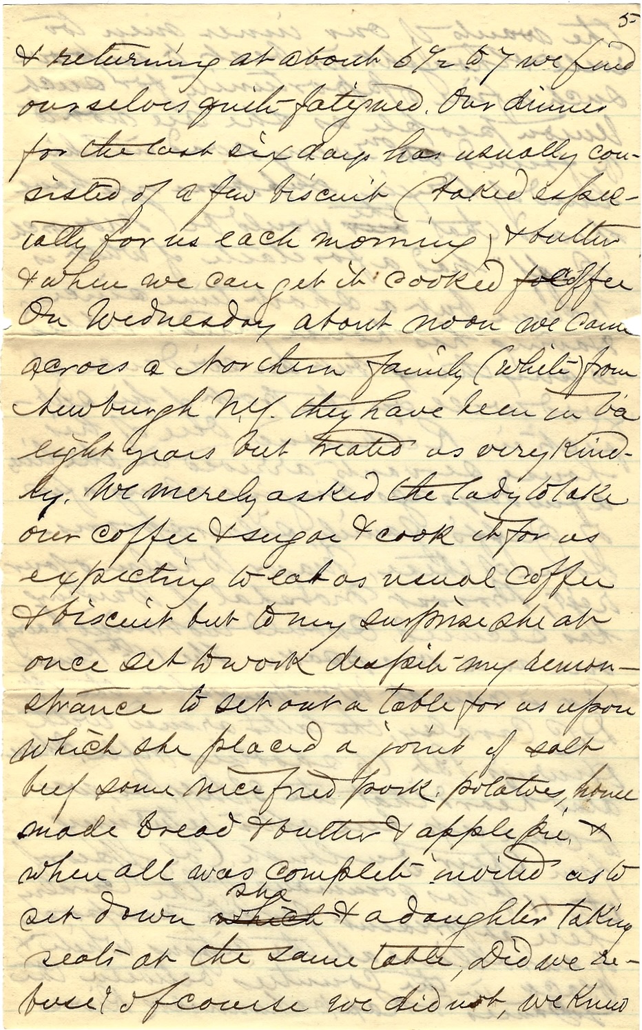 Again, on the same post, we had our morning milk & crackers and sweet potatoes for breakfast, & chicken soup for dinner. No trouble in getting all the sweet potatoes we want when away from camp & I do not feel any compunction of conscience in taking all secesh articles I want for my own use.