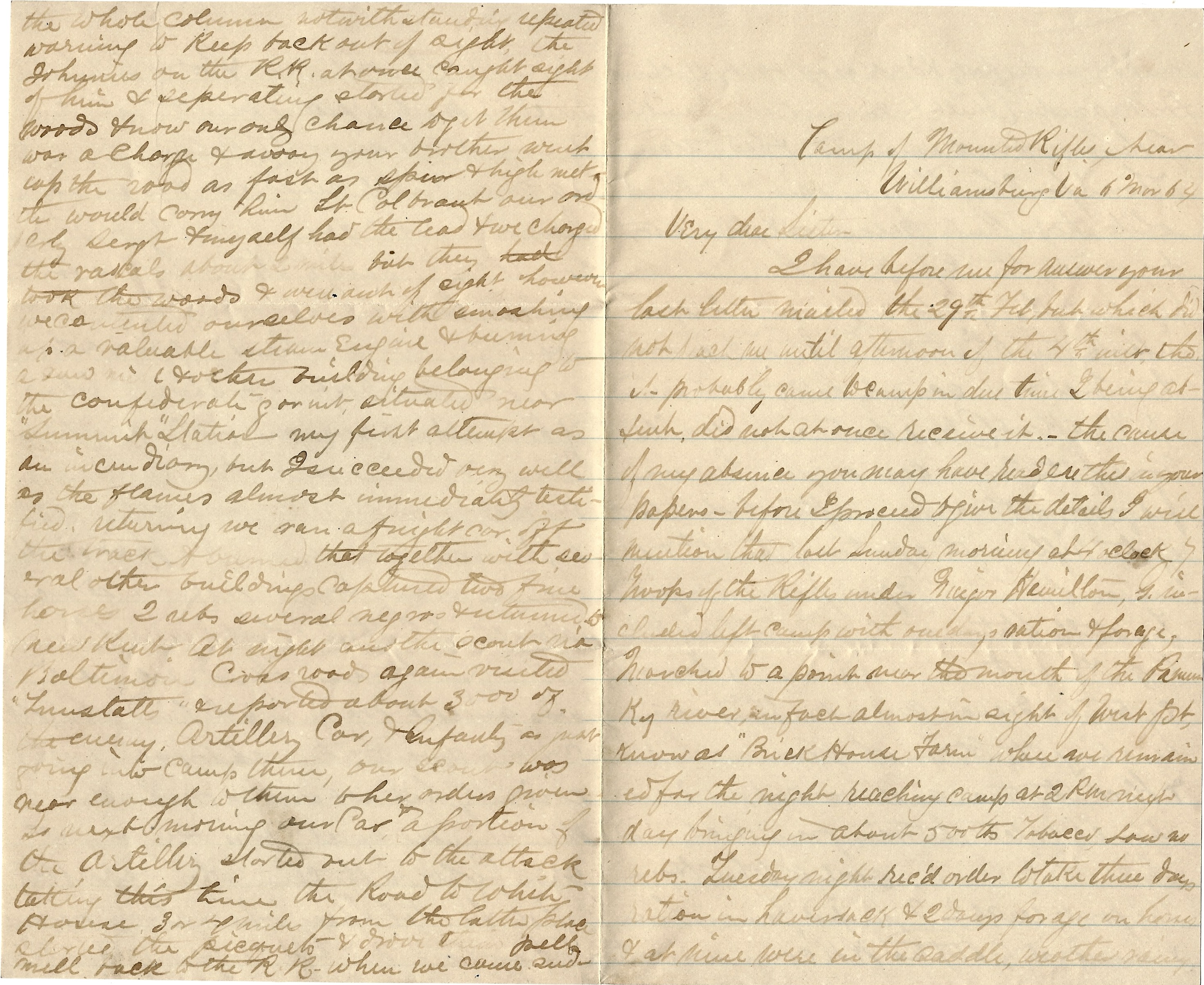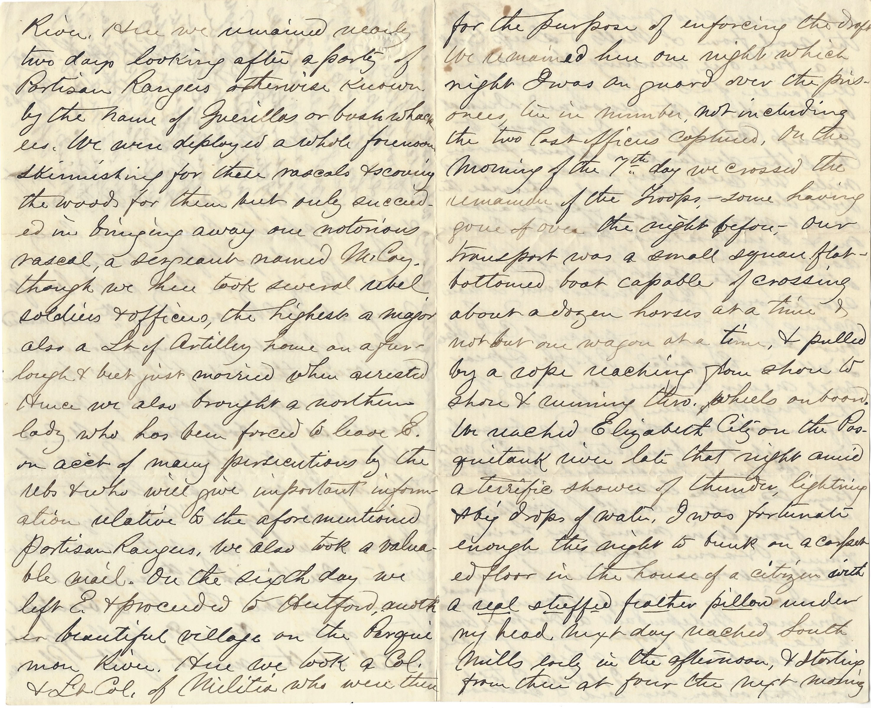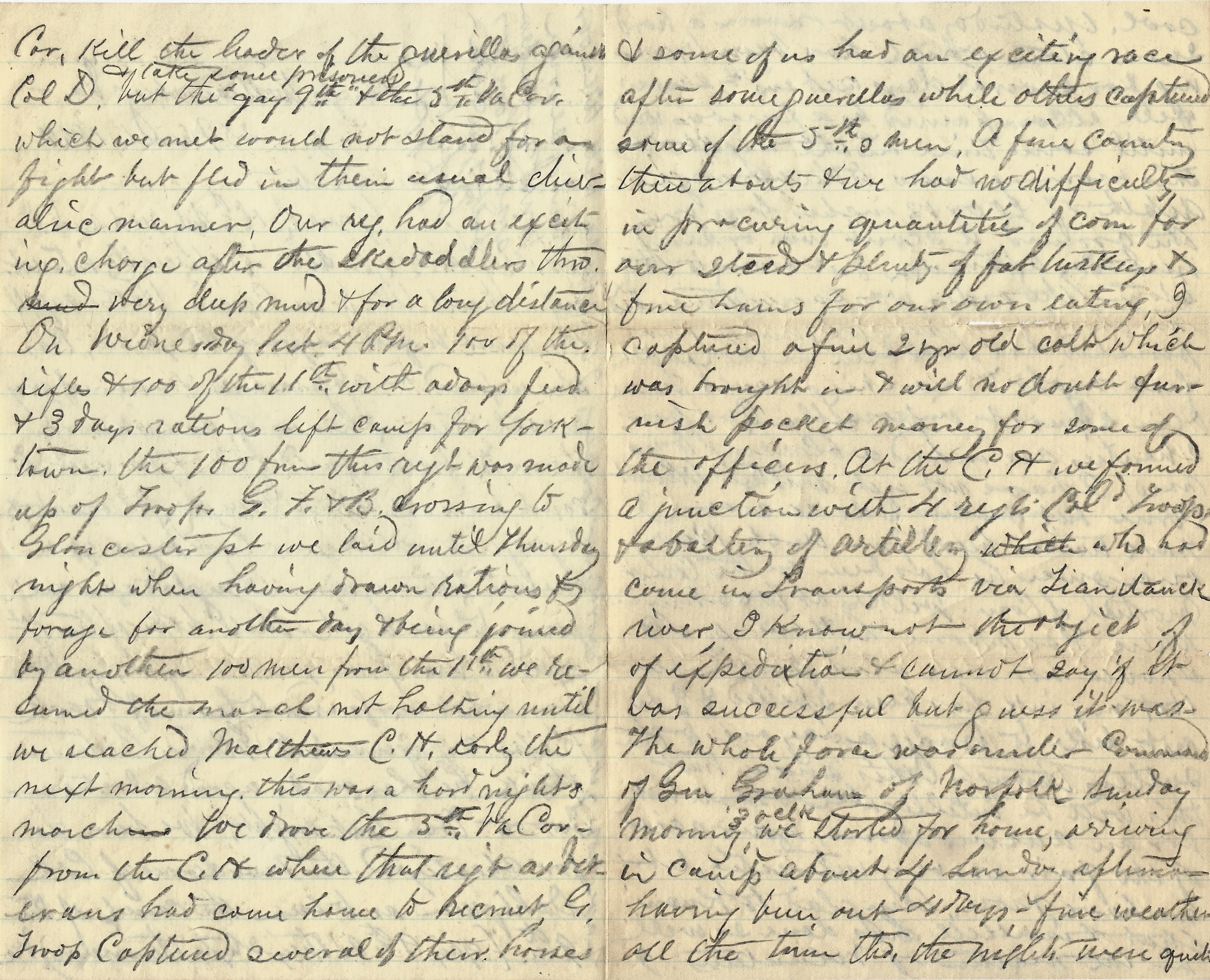 And now the reason of my delay in writing. Yours was received on the 13th in the evening. On the morning of that day we started on a scout in search of some rebels who had the night before attacked our pickets at Providence Church some six miles from Suffolk. We traveled all day making a circuit of some 35 miles, arriving in camp just at dark. Having read your letter, I turned in as did all at an early hour hoping to get a good night’s sleep, but had not been 15 minutes in bed before the regiment was turned out for another scout. This time we rode to Blackwater Bridge where at noon on Friday we shelled a rebel camp, across the river, from which the rebels ran. Co. B crossed and secured some tents, guns, and a lot of ammunition but being attacked, had a smart fight and lost 1 killed and 4 wounded. We marched on to Zuni, a small place on the Norfolk and Petersburg Railroad & seeing some rebels escaping to the woods, we gave the woods a vigorous shelling & must have done the rebels considerable injury as from the manner in which they replied with shot guns I judge they were posted in some force. From this place we returned to camp arriving at 9 on Friday evening having traveled some 55 or 60 miles, making in all since Thursday morning some 90 miles.