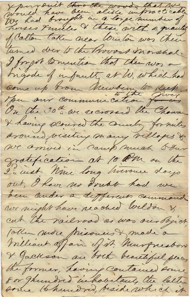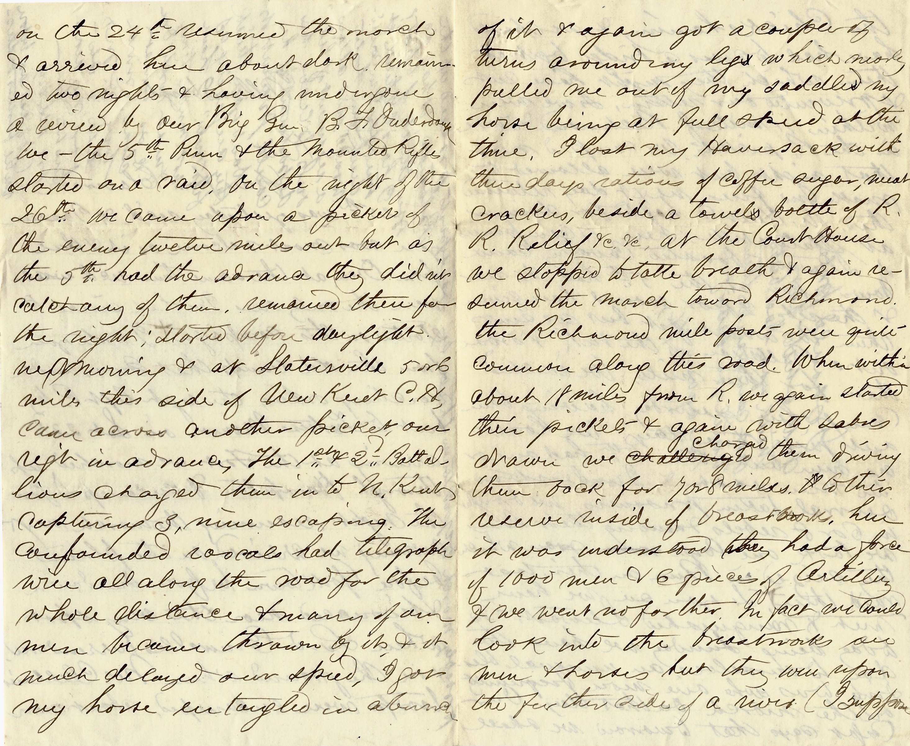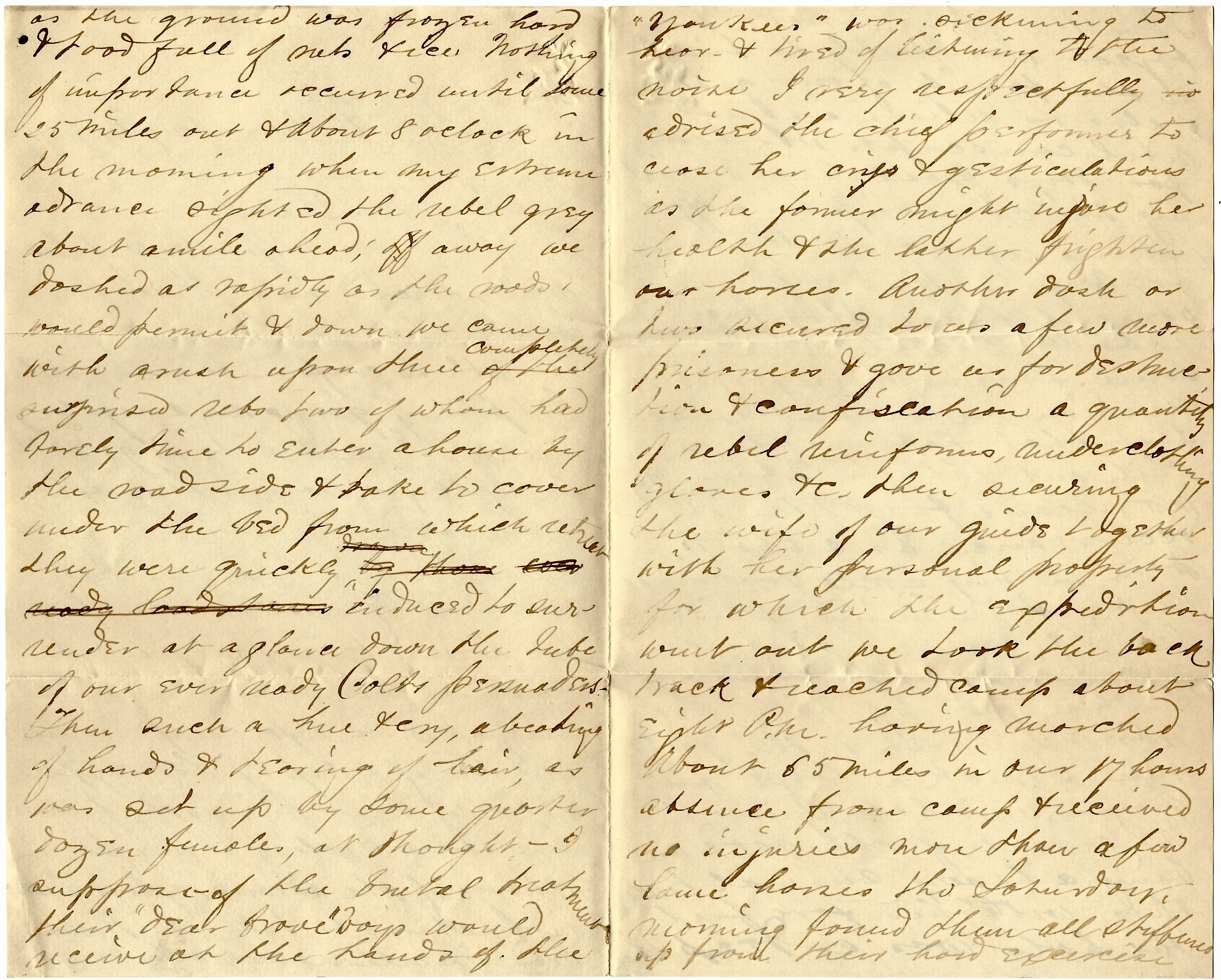 And now the reason of my delay in writing. Yours was received on the 13th in the evening. On the morning of that day we started on a scout in search of some rebels who had the night before attacked our pickets at Providence Church some six miles from Suffolk. We traveled all day making a circuit of some 35 miles, arriving in camp just at dark. Having read your letter, I turned in as did all at an early hour hoping to get a good night’s sleep, but had not been 15 minutes in bed before the regiment was turned out for another scout. This time we rode to Blackwater Bridge where at noon on Friday we shelled a rebel camp, across the river, from which the rebels ran. Co. B crossed and secured some tents, guns, and a lot of ammunition but being attacked, had a smart fight and lost 1 killed and 4 wounded. We marched on to Zuni, a small place on the Norfolk and Petersburg Railroad & seeing some rebels escaping to the woods, we gave the woods a vigorous shelling & must have done the rebels considerable injury as from the manner in which they replied with shot guns I judge they were posted in some force. From this place we returned to camp arriving at 9 on Friday evening having traveled some 55 or 60 miles, making in all since Thursday morning some 90 miles.