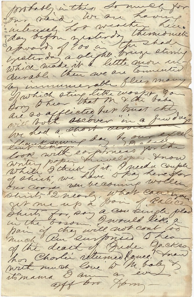 I received a letter from Charlie a few days ago. They were well. You think us better off than the Army of the Potomac. In many respects we are, and in some we are not. We have considerable rain and as a general thing, plenty of water. Yet it is more difficult to get food and clothing. As for vegetables, we get no sight at them, and if a man is wounded here, he cannot get the care he can in Virginia as it is so far from the hospital. Then if one is killed, he has to be buried as we cannot get him away.