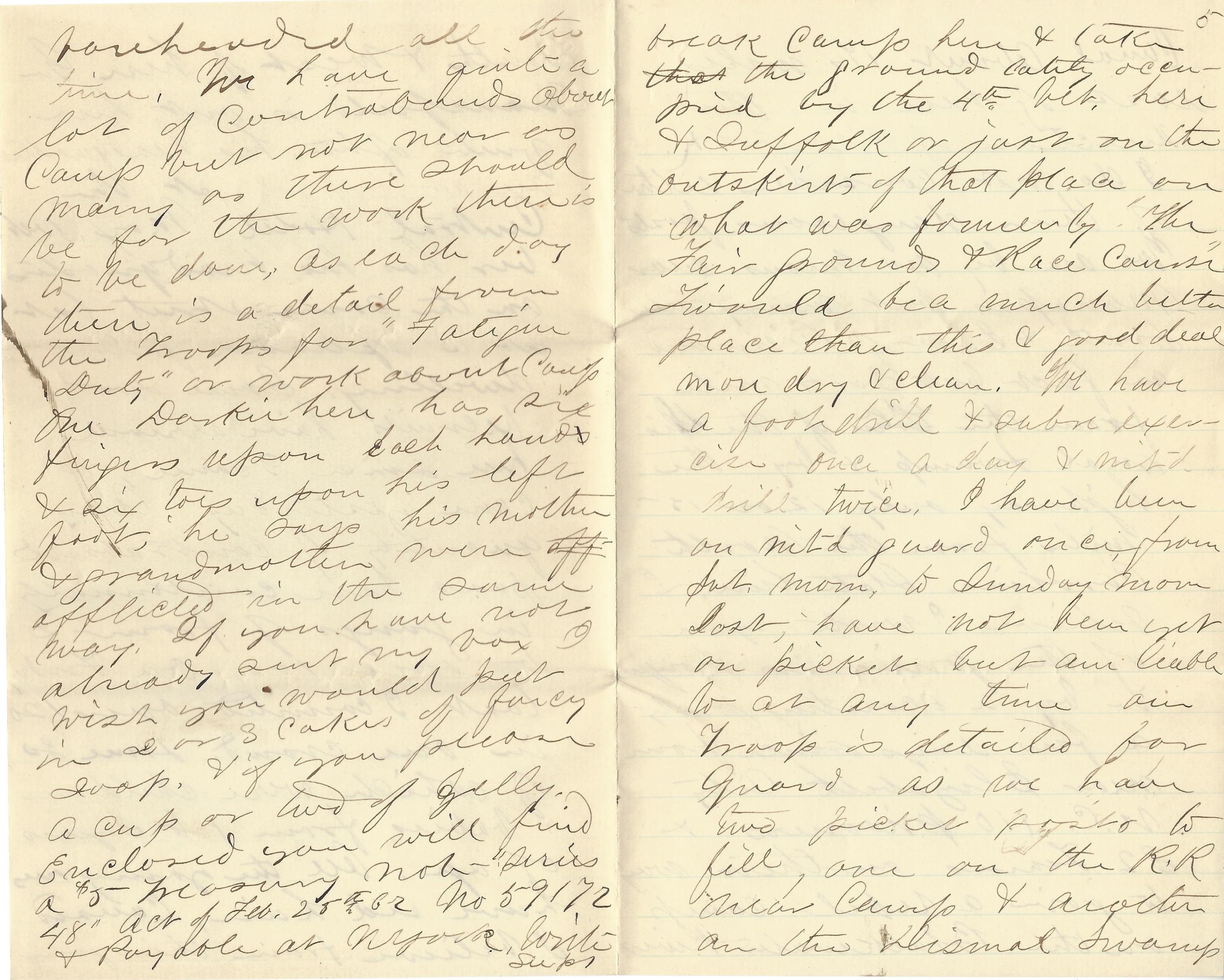 I rather like the business, perhaps because I have had good posts. For instance at the canal (Dismal Swamp Canal) about a mile east of here there are four posts or three posts & 1 patrol. When on guard there, we relieved at 9 a.m., twelve men—four for each relief. That is so that one man having been on post for two hours can remain off 4. I had the patrol there which extended from the canal east in the direction of Portsmouth about three miles, through woods, by cornfield, &c., occasionally a house & frequently a negro cabin along the road. A man whose orchard I passed kindly gave me as many nice large red apples as I could carry & at another time a negro gave me any quantity of “root beer” home manufacture. At another time while on the same duyt on the road north f Suffolk, having been sent out without forage or rations, not willing to starve or allow our horses todo so, we foraged corn from them and sweet potatoes for ourselves, killing a young porker which with some milk * bought stood us very well.