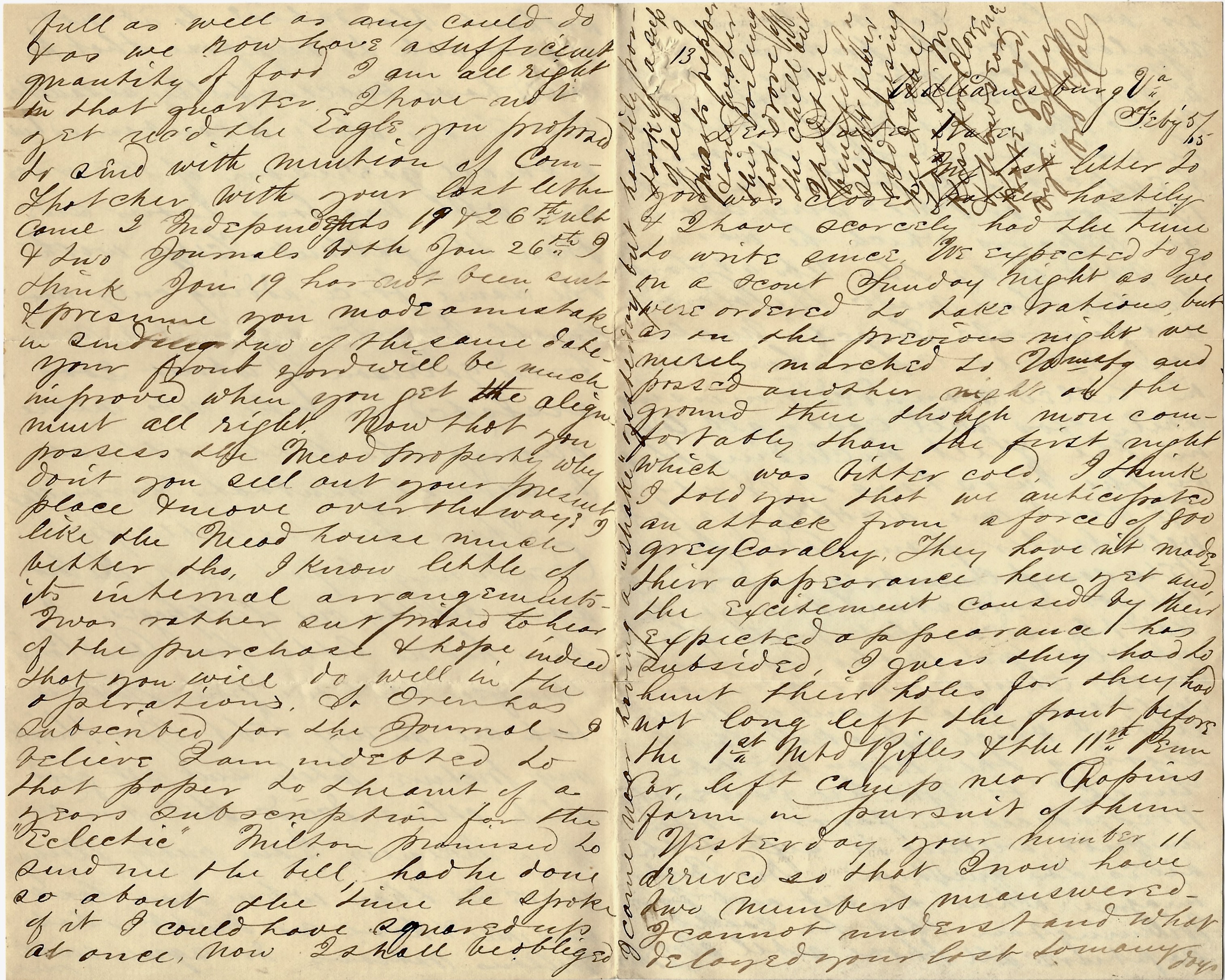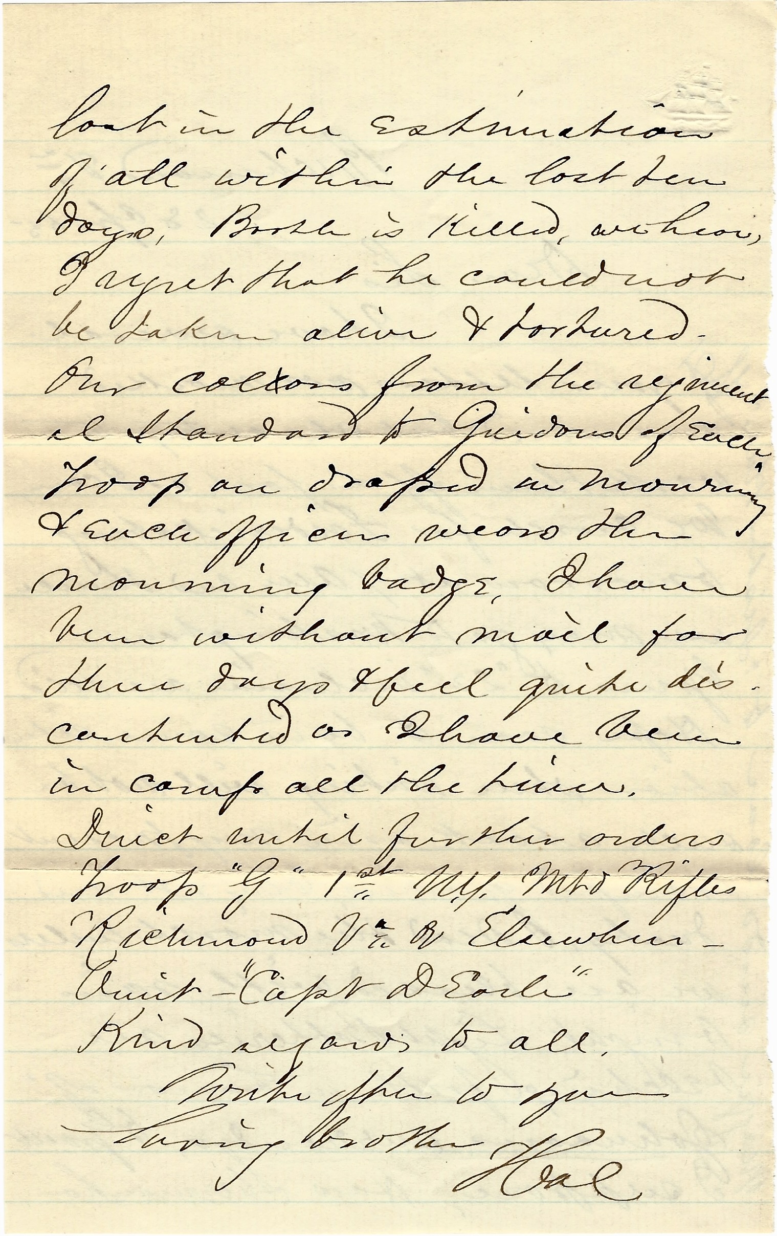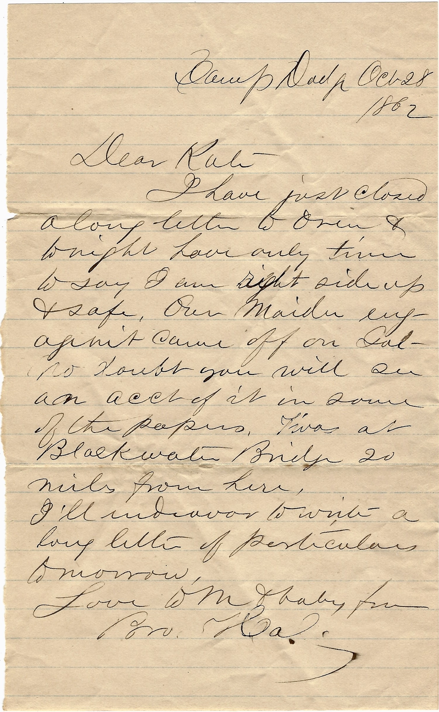 I have just closed a long letter to Oren & tonight have only time to say I am right side up and safe. Our maiden engagement came off on Saturday. No doubt you will see an account of it in some of the papers. T’was at Blackwater Bridge 20 miles from here. I’ll endeavor to write a long letter of particulars tomorrow. Love to Milton and baby. From brother, — Hal
