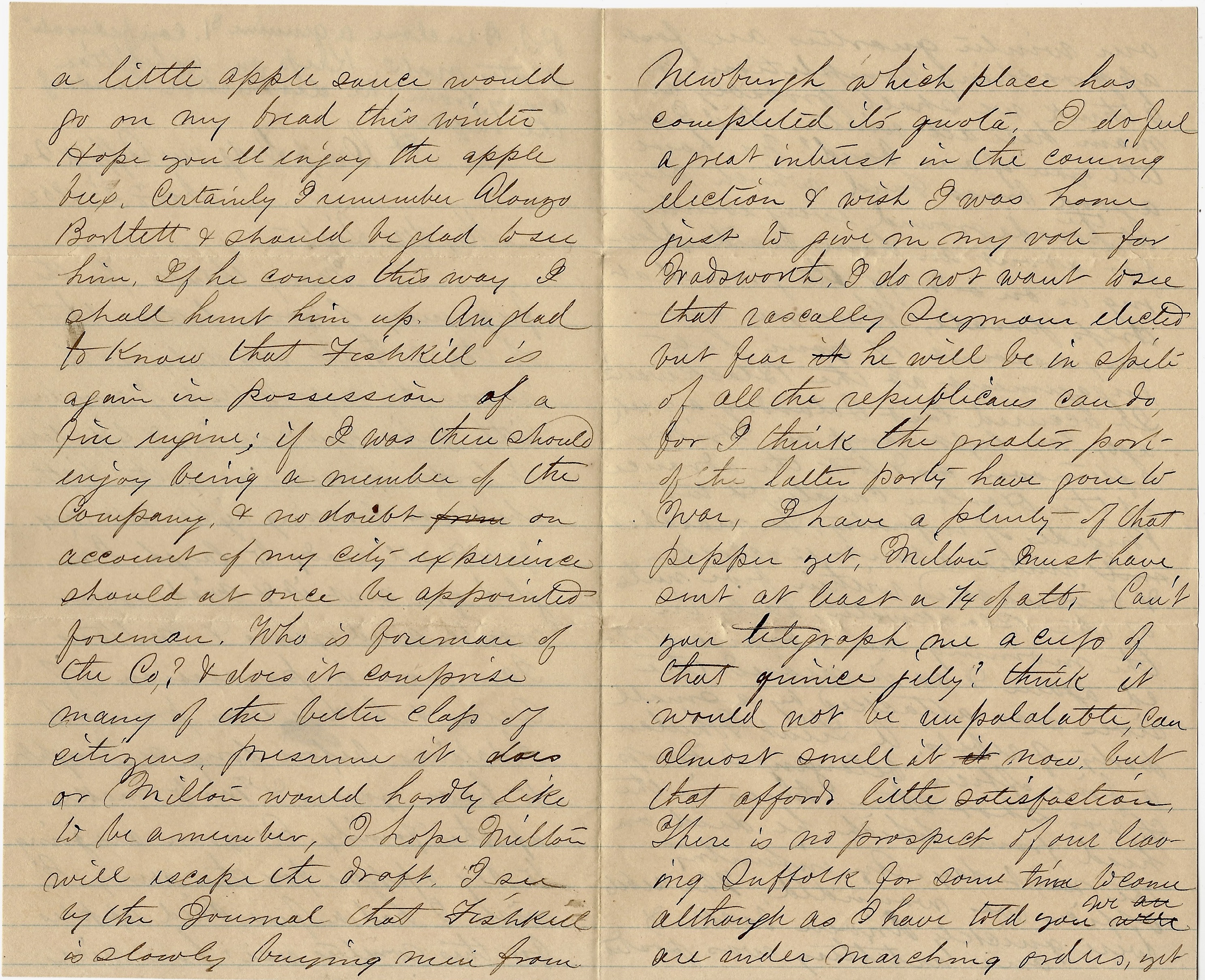 I hope Milton will escape the draft. I see by the Journal that Fishkill is slowly buying men from Newburgh which place has completed its quota. I do feel a great interest in the coming election & wish I was home just to give in my vote for Wadsworth. I do not want to see that rascally Seymour elected but fear he will be in spite of all the Republicans can do for I think the greater part of the latter party have gone to war.