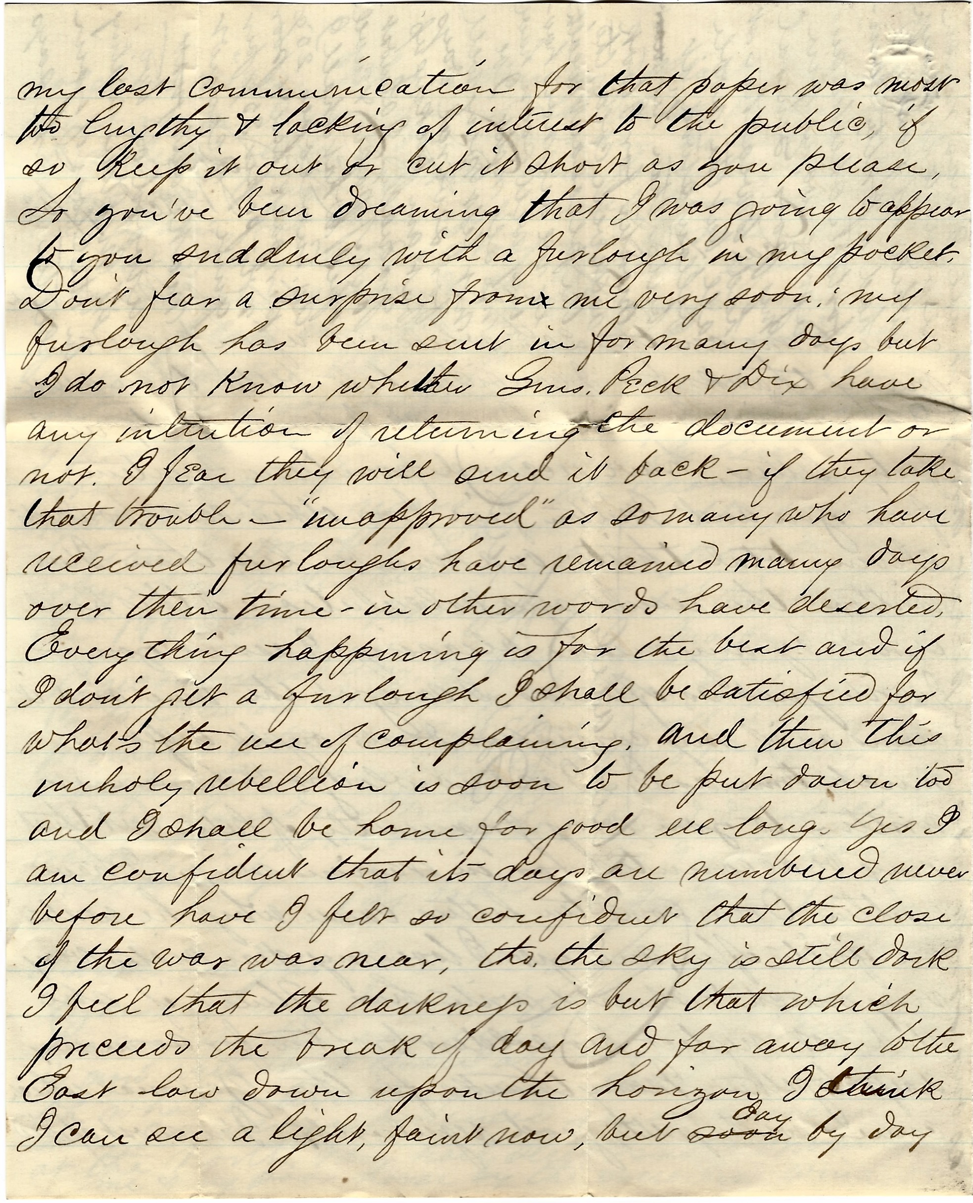 There are a few furloughs granted—5 per 100 men—but most that have applied have been disapproved for some cause, I know not why. It is so very far, costs so much time 20 days, and my friends so scattered it would hardly be beneficial for me to come home at present as my stay would be short I could hardly have time to say how do you do and goodbye. I suppose your church is getting along finely, nearly completed. I hope to worship with you there yet. It ay not be so yet I will try so to live that we shall meet in the great assemblage of the just, where war and discord are never known.