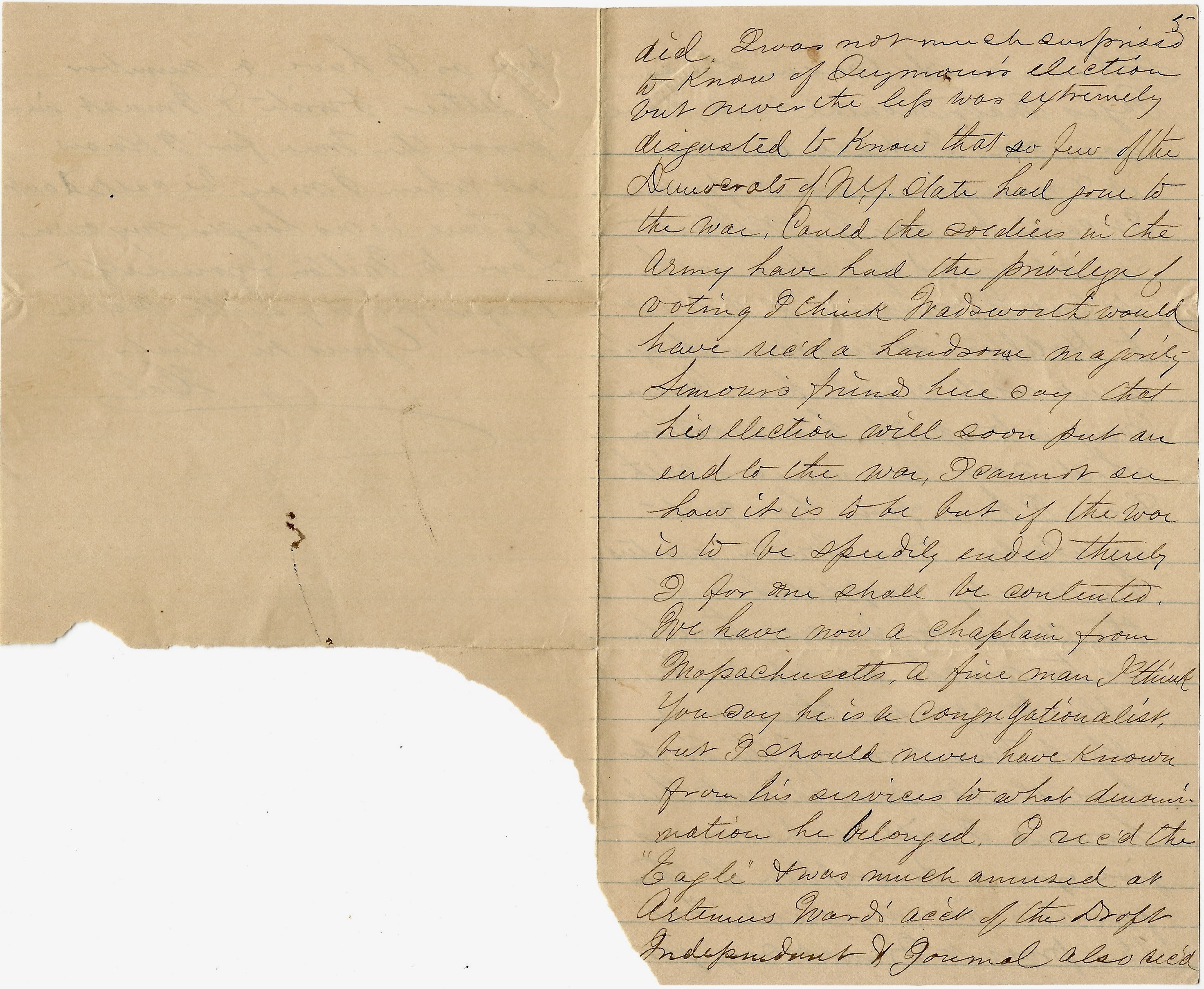 We have now a chaplain from Massachusetts—a fine man. I think you say he is a Congregationalist but I should never have known from his services to what denomination he belonged. 1 I received the Eagle & was much amused at Artemus Ward’s account of the draft. Independent and [Fishkill] Journal also received.
