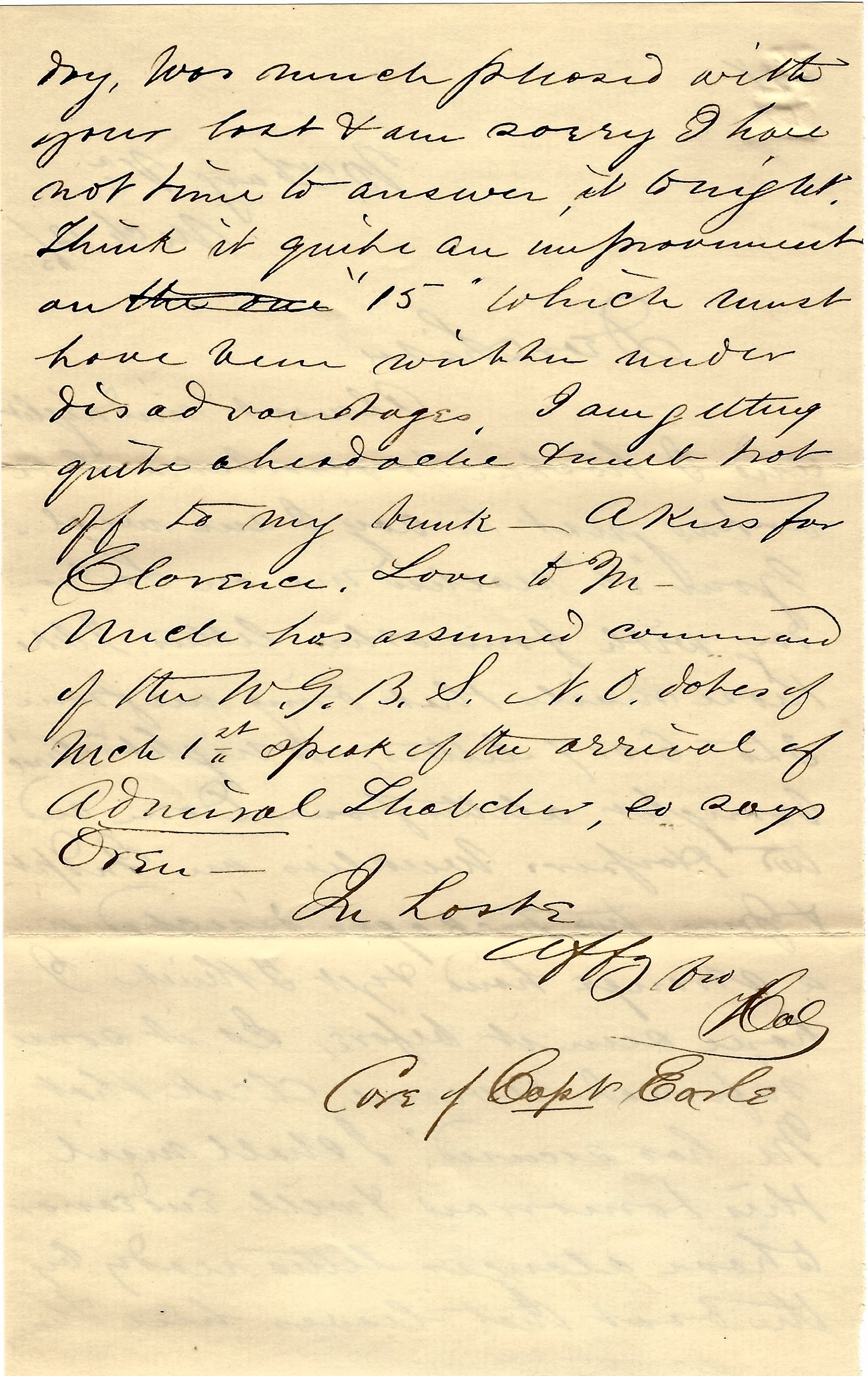 Our time is growing short as we are but nine months men now. Some of our men talk of reenlisting in the Navy as they offer 1400 dollars bounty and 60 days furlough home at the commencement of the year, then 30 days each year. They have to enlist for five years. I think I will wait until I have been free for a time at least before I enlist. I think I have done pretty well to give three years service.