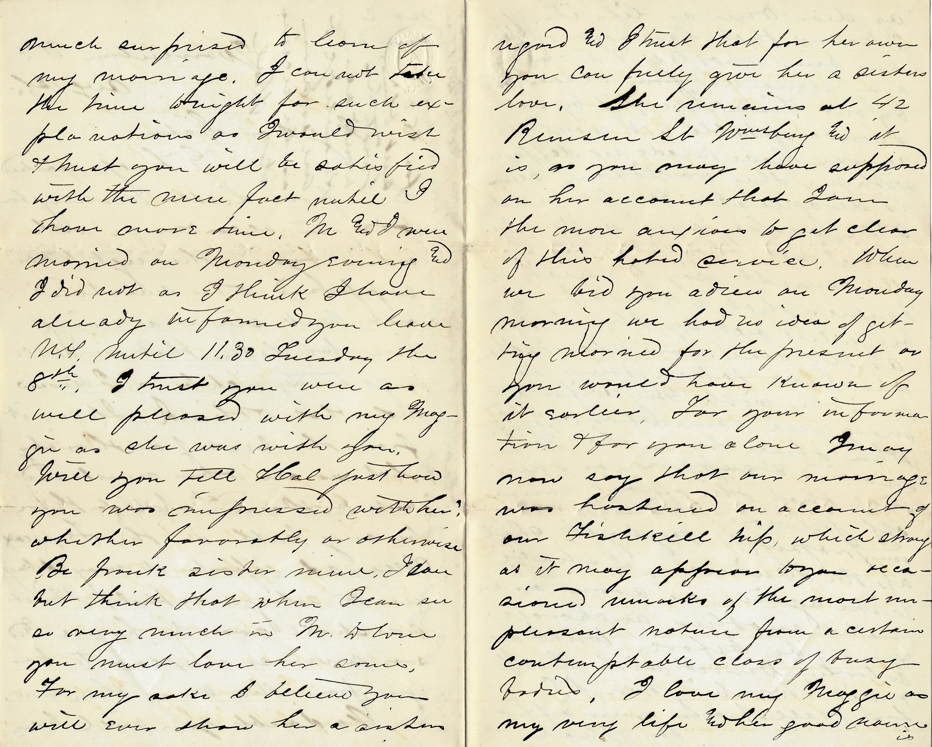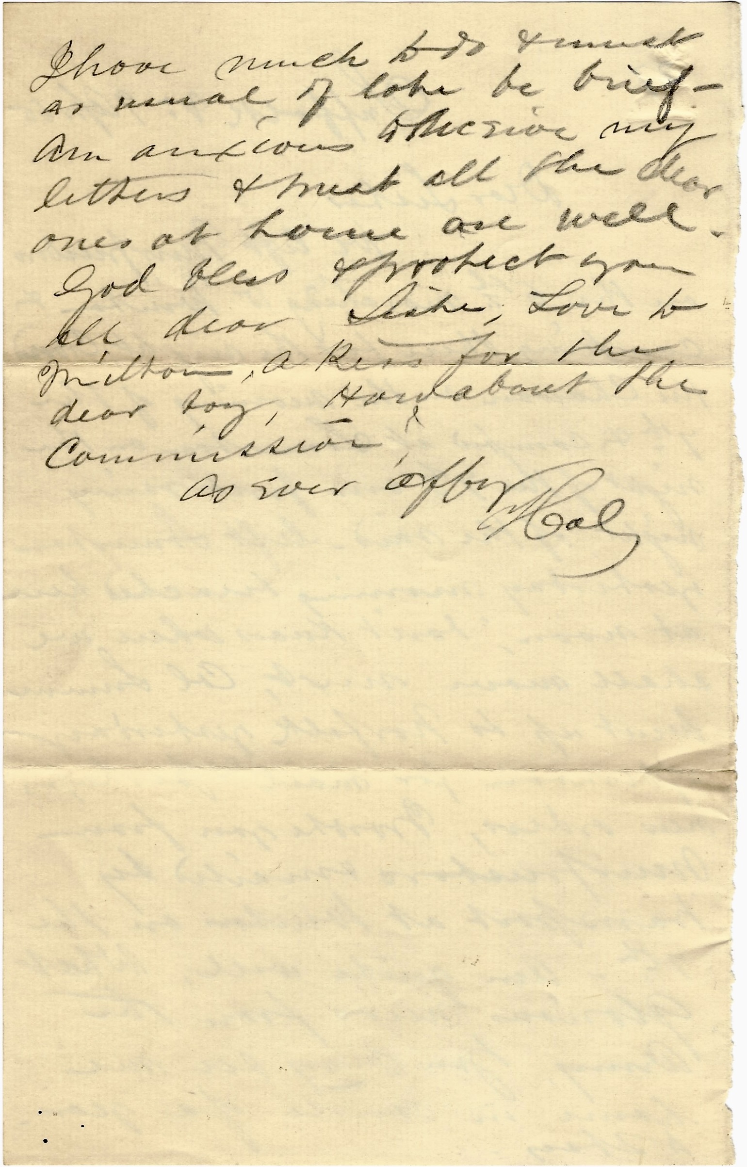 Remember me to all enquiring friends. Kiss little chub. Give love to Milton and see that he writes when he has time. Write soon to your very affectionate brother, — Hal