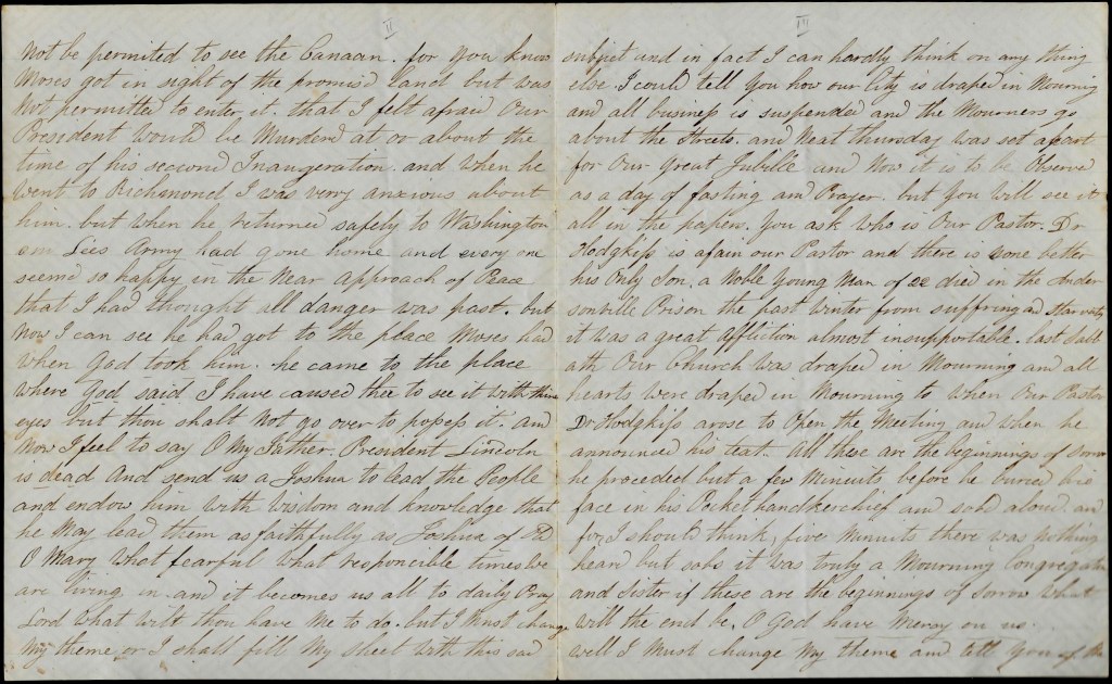 But Sister, I must tell you how I have felt for the past year about him. I have seen such a true semblance between him and Moses and have been so afraid he would not be permitted to see the Canaan—for you know Moses got in sight of the promised land but was not permitted to enter it, that I felt afraid our President would be murdered at or about the time of his second Inauguration, and when he went to Richmond I was very anxious about him. But when he returned safely to Washington and Lee’s Army had gone home and everyone seemed so happy in the near approach of Peace, that I had thought all danger was past. But now I can see he had got to the place Moses had when God took him. He came to the place where God said I have caused thee to see it with thine eyes, but thou shall not go over to possess it. And now I feel to say, O My Father, President Lincoln is dead, and send us a Joshua to lead the people and endow him with wisdom and knowledge that he may lead them as faithfully as Joshua of old.