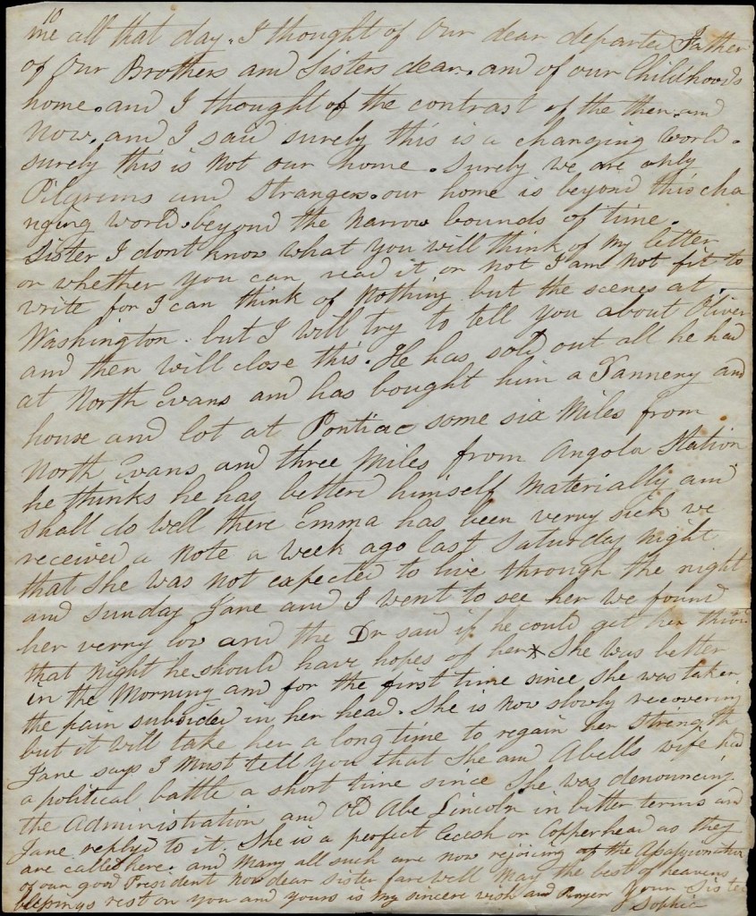 Sister, I don’t know what you will think of my letter or whether you can read it or not. I am not fit to write for I can think of nothing but the scenes at Washington. But I will try to tell you about [brother] Oliver [Hazard Perry Williams] and then will close this. He sold out all he had at North Evans and has bought him a tannery and house and lot at Pontiac some six miles from North Evans and three miles from Angola Station. He thinks he has bettered himself materially and shall do well there. [His wife, Emma [Parthenia (Lake) Williams] has been very sick. We received a note a week ago last Saturday night that she was not expected to live through the night and Sunday [my daughter] Jane and I went to see her. We found her very low and the Dr. said if he could get her through that night, he should have hopes of her. She was better in the morning and for the first time since she was taken the pain subsided in her head. She is now slowly recovering but it will take her a long time to regain hers strength. Jane says I must tell you that she and Abell’s wife had a political battle a short time since. She was denouncing the Administration and Old Abe Lincoln in bitter terms and Jane replied to it. She is a perfect secesh or Copperhead as they are called here, and Mary, all such are now rejoicing at the Assassination of our good President. Now dear sister, farewell. May the best of heavens blessings rest on you and yours is my sincere wish and prayer. Your sister, — Sophia