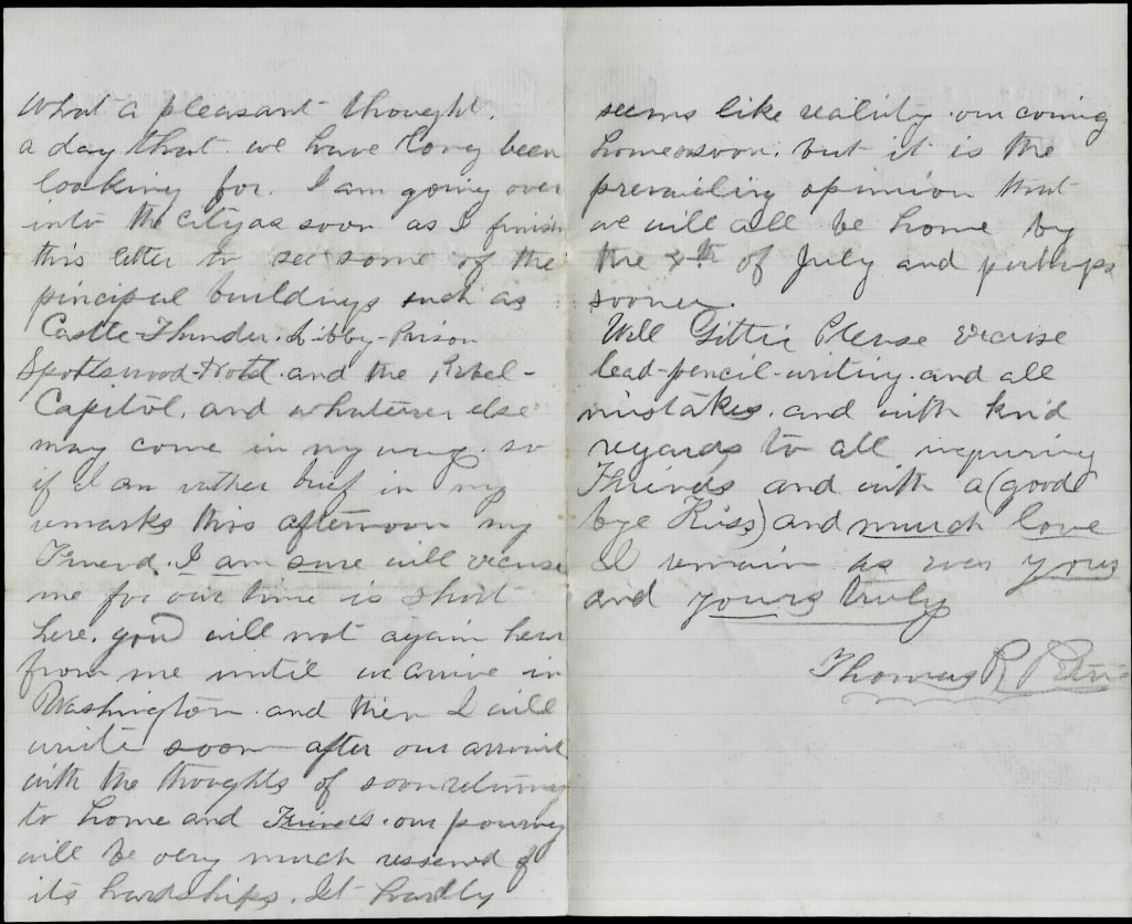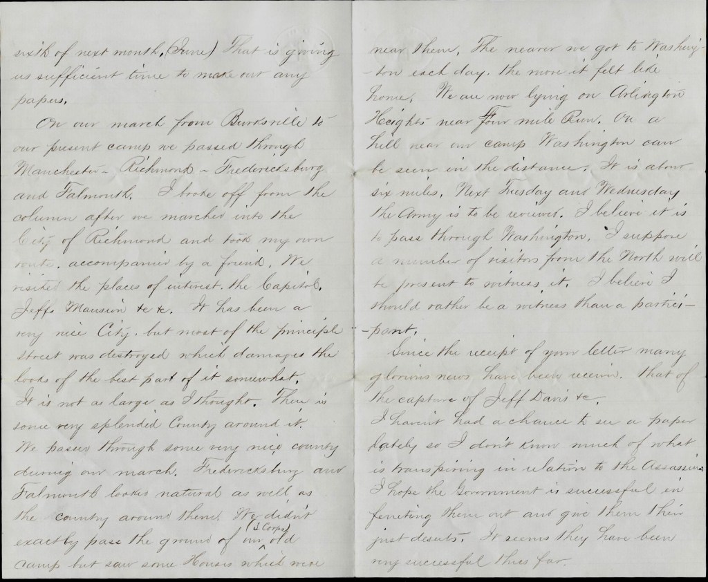 In your letter you say you would like to have been at the [Grand] Review at Washington. It was a grand sight. My Regiment was the last one to pass in review the first day.