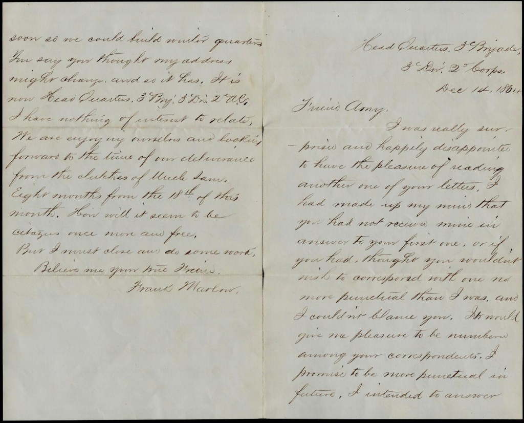 I am a true soldier of Uncle Sam, belong to the Army of the Potomac and having lots of spare time, nothing would suite me better than to correspond with a few young ladies of the loyal North. Object, mutual improvement and to pass away the dull hours of camp life. Address FRANK MARLOW, Hd. Qrs. 1st Brig., 2nd Div., 3d Corps, Washington, D.C.