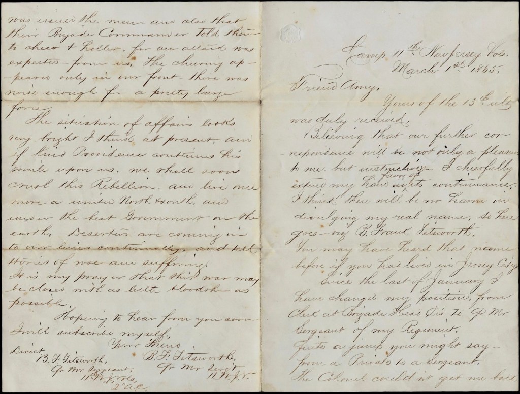 The situation of affairs looks very bright I think at present. And if divine providence continues his smile upon us, we shall soon crush this rebellion and live once more a united North and South under the best government on the earth. Deserters are coming in to our lines continually and tell stories of woe and suffering. It is my prayer that this war may be done with as little bloodshed as possible. Hoping to hear from you soon. I will subscribe myself, your friend, — B. F. Titsworth, Quartermaster Sergeant 11th New Jersey Volunteers