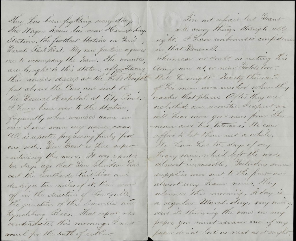 We are still on the move. Broke camp last Wednesday morning and the troops marched to the left where they have been since advancing gradually. The 5th Corps and Sherman’s cavalry force are on the left of us. There has been fighting every day. The wagon train lies near Humphrey’s Station—the farthest station on General Grant’s railroad. My new position requires me to accompany the train. The wounded are brought to this station after having their wounds dressed at the field hospital, put aboard the cars and sent to the General Hospital at City Point. I have been over to the station frequently when wounded came in and I saw some very severe cases.