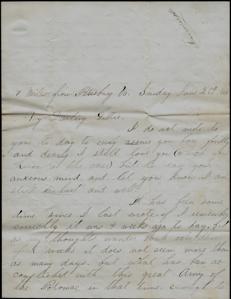 Responding to the ad was a young woman named Amanda Wallace of Lawrenceville, Alleghany county, Pennsylvania, who also began her correspondence with Frank under a false name and address—“Amy Waterman” of Pittsburgh. Beginning with the third letter in this collection, both parties apparently had convinced themselves they wished to continue their correspondence and to do so under their real names. Whether they carried on their correspondence beyond the last of these letters is unknown but is doubtful. In any event, Frank’s letters provide some good information on the closing days of the war around Petersburg.