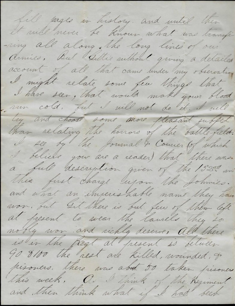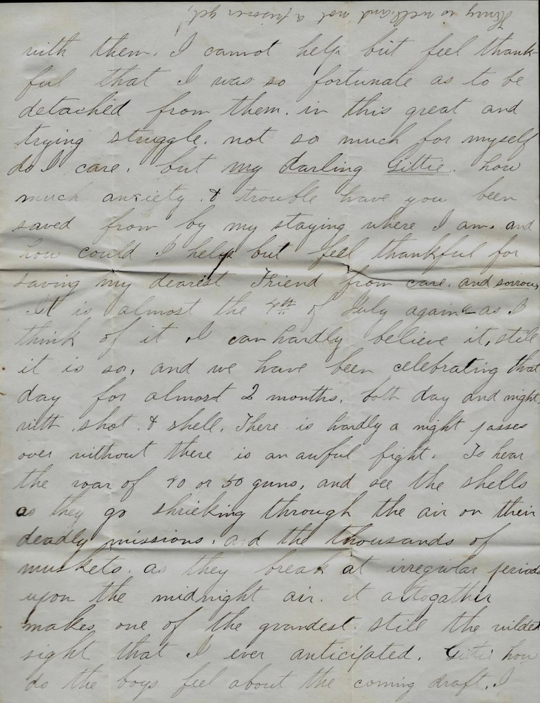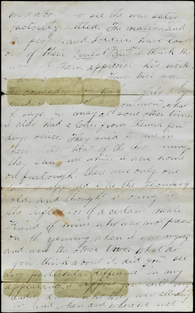 You say that “you have never told me directly but once that you did not wish my correspondence.” I don’t recollect the time. I guess I didn’t mean it. You spoke about writing this letter on the Sabbath. I suppose you want my opinion on the subject. When I was at home, I wouldn’t write a letter on the Sabbath unless to a soldier engaged in active service. I don’t know as there is any sin in writing on the Sabbath. However, I very seldom do it.