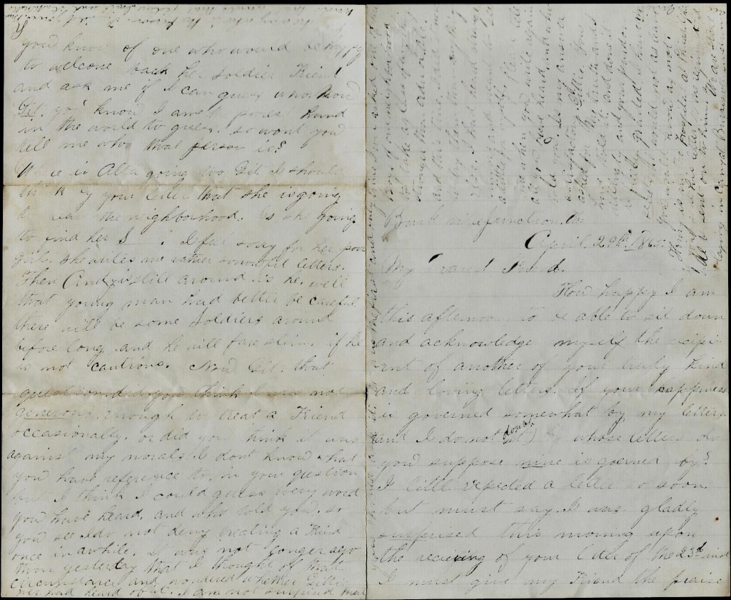 Words nor tongue can express my delight at receiving your much welcome letter of April 14th which came duly to hand last night & also one of the 12th that has just arrived today. It being directed to Harper’s Ferry, I did not get as soon as I should if it had been directed as the other was. Under the present circumstances I shall be obliged to answer them both in one.