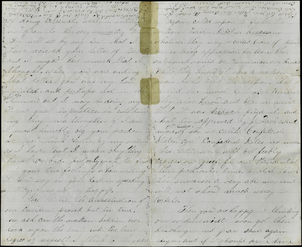 In this letter, Benjamin describes the emotional impact on himself and the community of Bloomington, Illinois, upon receiving news of the assassination of President Abraham Lincoln. He also shares a remembrance of having been at a Ford’s Theatre performance the previous September when the news of the fall of Atlanta was announced, in stark contrast to the news of the assassination. He also, surprisingly, shares his wonderment that an assassination attempt had not been made previously during Lincoln’s daily sojourn to the cottage he kept at the Soldier’s Home. Finally he mentions briefly the arrest and near hanging of a resident in Bloomington who celebrated Lincoln’s death.