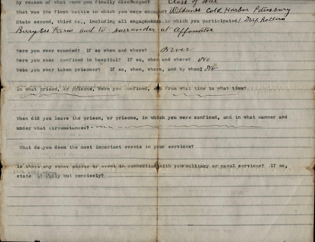 Yours of April 30th was received the day we reached Manchester. I hoped to answer it before but pressure of business would not permit. Leaving Burkeville at the time we did put me behind in my monthly papers. But since we reached this camp, I have worked pretty busy and finished them this forenoon. We have commenced to make out our “muster out rolls” and “discharge papers” and shall be very busy until we start for home which time, I think, will not be two weeks from date. The boys are highly pleased at the prospect of getting home so soon. Nothing would suit me better. I have made up my mind to be a citizen by the sixth of next month (June). That is giving us sufficient time to make out any papers.