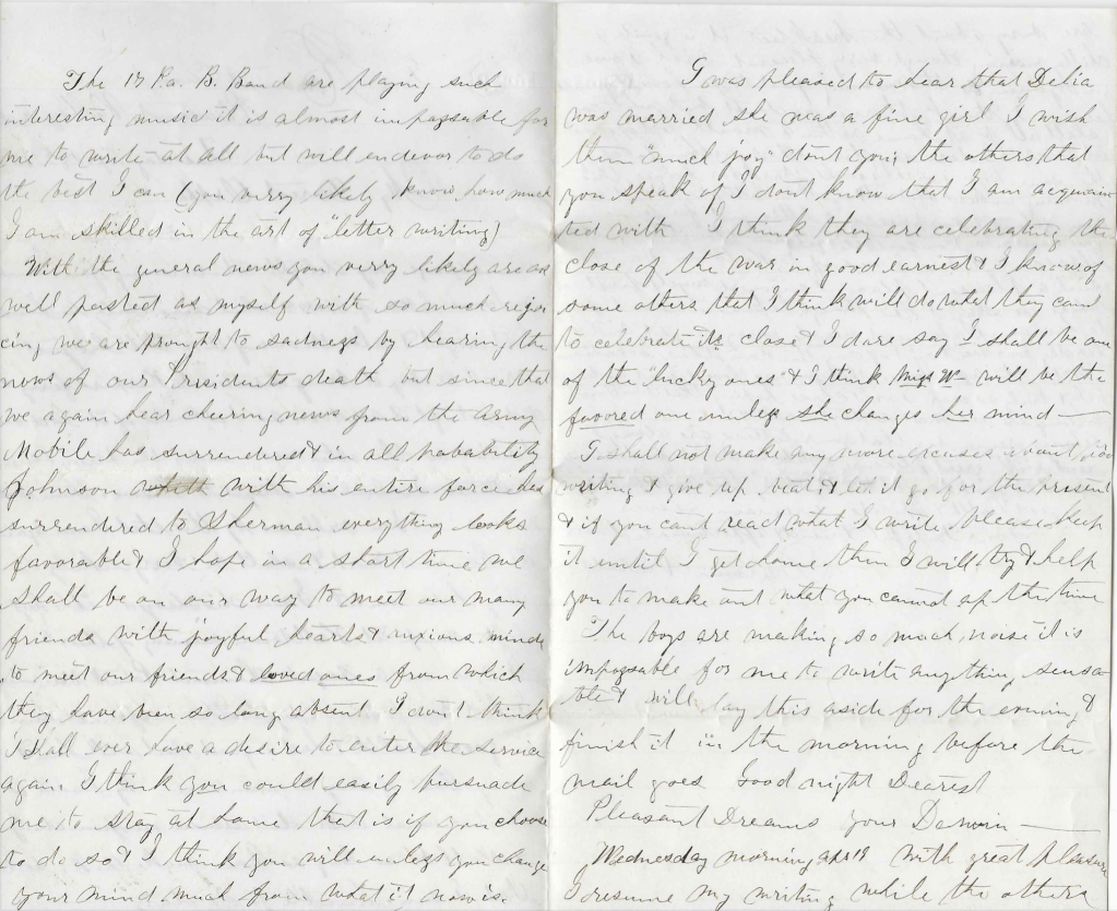 I was pleased to hear that Delia was married. She was a fine girl. I wish them “much joy,” don’t you? The others that you speak of I don’t know that I am acquainted with. I think they are celebrating the close of the war in good earnest & I know of some others that I think will do what they can to celebrate its close & I dare say I shall be one of the “lucky ones” & I think Miss W. will be the favored one unless she changes her mind…