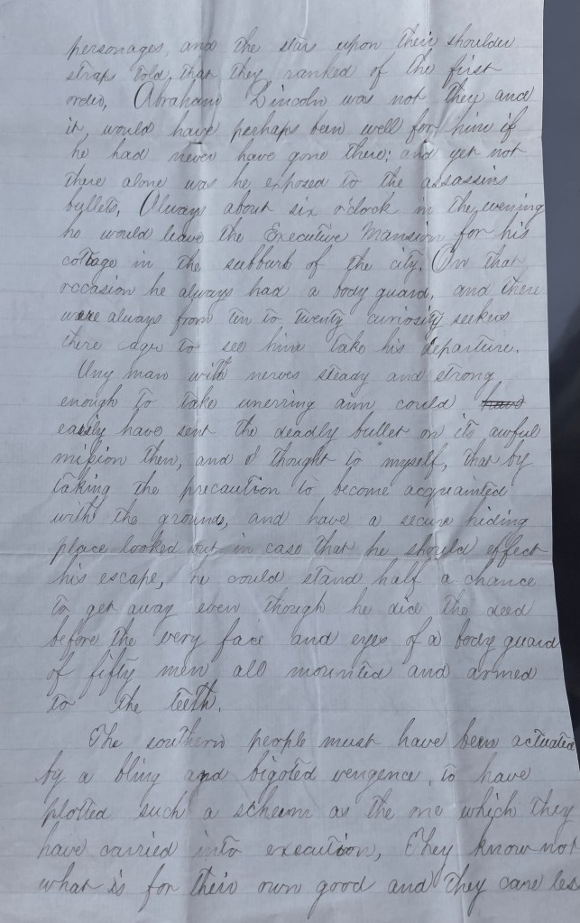 The 10th of April was a day long to be remembered in Boston. But it seemed that their rejoicing was soon to be turned to mourning. The morning of the 15th I shall never forget. As I went to the store everybody looked so sad that I wondered what could be the reason of it. Upon entering the [store] I asked one of the salesmen why it was everyone looked so sad. And they said, did you not know that our President had been killed. I could hardly believe it. But upon opening the paper, I found that it must be so. And upon returning home that afternoon the buildings were everywhere draped in mourning. Such a sad sight as Boston presented that week will be long remembered.