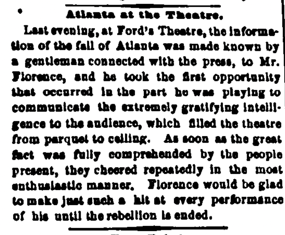 Daily National Republican, W. D. C., 3 September 1864. Mr. William Jermyn Florence (1831-1891)—who made the announcement according to the newspaper clipping—and his wife, Malvina Pray, were actors performing a Benefit at Ford’s Theatre on that evening.William’s actual surname was Conlin. He generally portrayed an Irishman and she a Yankee.