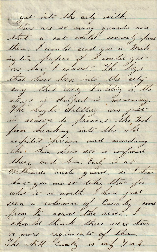 The boys that have been into the City say that every building on the street is draped in mourning. The Light Artillery was just in season to prevent the mob from breaking into the old Capitol Prison and murdering Gen. Lee’s son [who] is confined there. And Gen. Early is at Williard’s [Hotel] under guard, so I hear, but you must take that for what it is worth. I have just seen a column of cavalry come from Virginia across the river. I should think that there were two or more regiments of them. The New Hampshire cavalry is only 7 or 8 miles from here doing picket duty.