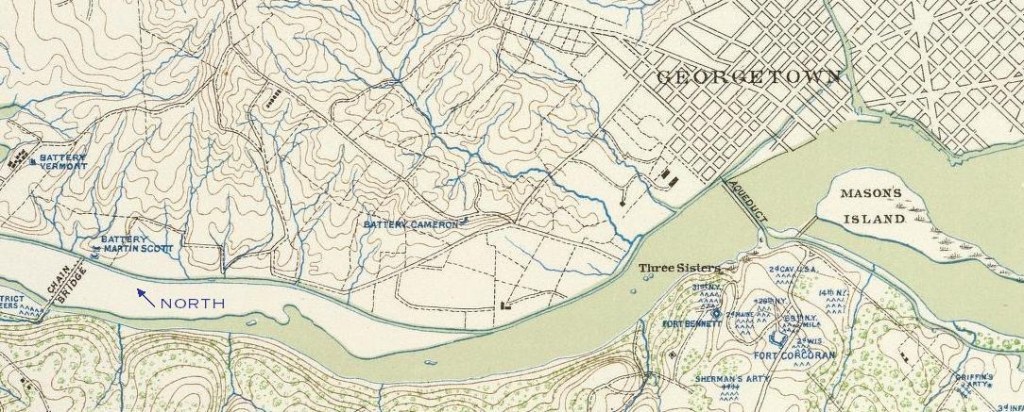 Map showing location of Battery Cameron west of Georgetown overlooking the Potomac. Now the location of the German Embassy.