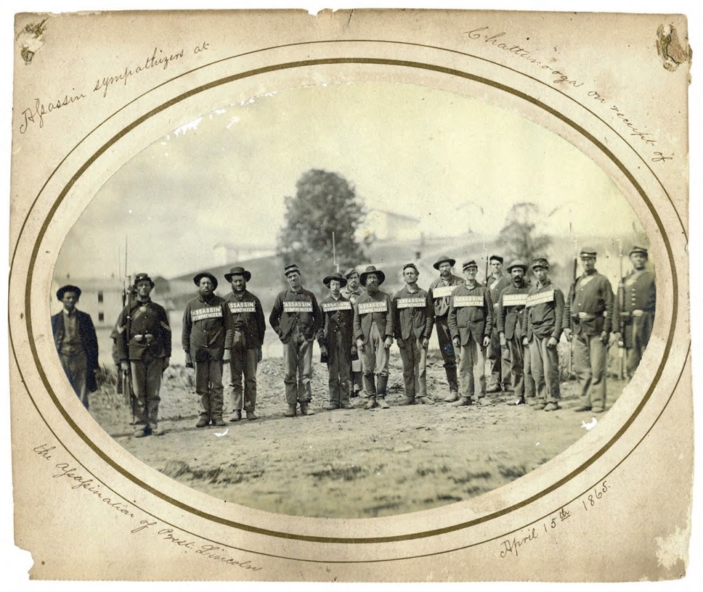 ASSASSIN SYMPATHIZERS FACE PUNISHMENT.—Not all Union men mourned the loss of their leader. The Nashville Press described this image shortly after it was taken on April 15, 1865. “We saw a photograph yesterday of ten men who were arrested at Chattanooga on Sunday last for expressing pleasure at hearing of the death of President Lincoln,” reported a correspondent, who added, “Upon the breast of each was a tin plate with the words ‘Assassin Sympathizer’ painted on it.” The men were sentenced to labor on the streets in Chattanooga by day while wearing the placards, and by night they were confined in irons.
