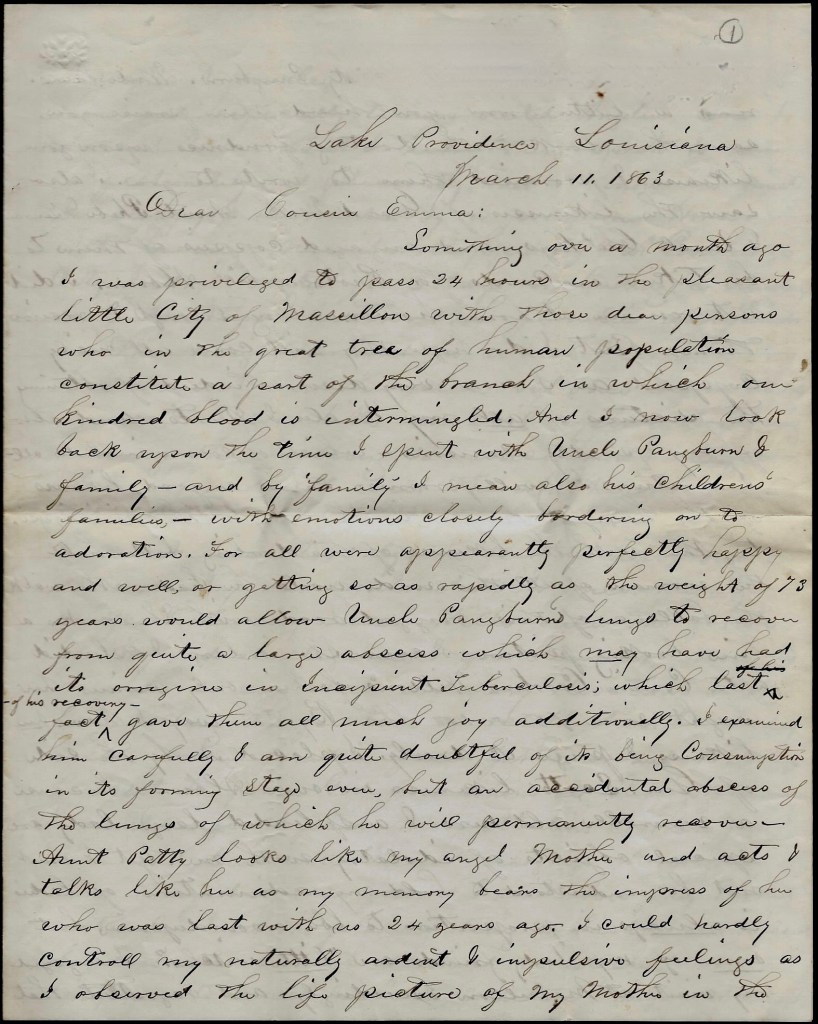 Cousin Emma, I hope this letter will not scare you so you will not write again. Please address me at Lake Providence, La. (to follow the regiment) & should I not be—O! what a bungle. Let’s begin again. Address, S. T. Trowbridge, Surgeon, 8th Regt. Illinois Infantry, Logan’s Division, Lake Providence, La. (to follow the regiment) & I will be sure to get it somewhere. Give my compliments to all my uncles and aunts and their children., my cousins, &c. &c. Also to your brother, the doctor. And to you I am under very many obligations for writing to me. When this awful war is over, I am coming to visit in Pennsylvania if I live & I am trying my best to live.