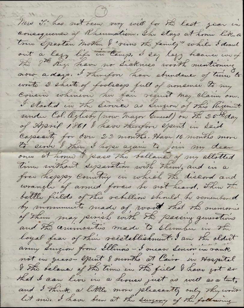 I started in the service as Surgeon of this Regiment under Col. Oglesby (now Major General) on the 25th day of April 1861 & have therefore spent in said capacity for over 22 months. Have 16 months more to serve & then I hope again to join my dear ones at home & pass the balance of my allotted time without separation with them, and in a free, happy country in which the discord and wrangle of armed forces be not heard. Then the battlefields of this rebellion should be remembered by monuments made of wood that the memories of them may perish with the passing generations and the animosities made to slumber in the loyal fear of their reestablishment.