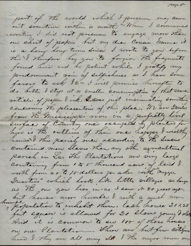 We are 3 miles from the Mississippi river in a perfectly level surface of country once occupied by planters for here is the outlines of their once happy and wealthy homes & this parish once, according to the census, contained more slaves than any other agricultural parish in Louisiana. The plantations are very large containing from 1 to 5 thousand acres of land and worth from 40 to 75 dollars per acre with “nigger quarters” which look like little villages as large as the one you live in as I saw it 20 years ago. But house [are] more humble & with a much more humble population to inhabit them. Each house 20 x 20 feet square is allowed for 20 slaves, young and old. And it is common to see 100 of those houses on one plantation. There are but few citizens here and they are all very old & the negro men are all run off South & farther back together with such movable property as could be transported. I saw, a few days ago, a couple of young ladies who had been 8 years in Kentucky at a boarding school return here to what was once their home and is yet not confiscated & saw them meet the old and young negros of the plantation, saw old greasy wenches throw their arms around them and kiss them & saw the young ladies kiss the negroes back again & have a big time in that way generally.