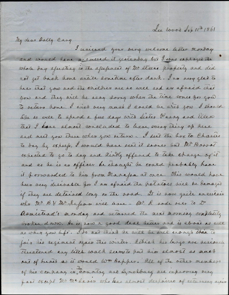 He sends Matty fifty kisses which he say you must deliver and that you must not let Clayton forget him. Lucy is very much interested in the sewing society. She has attended both of the meetings since you left. I believe they are doing very well. Mrs. McDaniel makes an energetic president. The Bolleny’s are doing much better now than at first. I saw the Doctor today and he told me he had htirteen sick soldiers staying with him. This is doing his duty bravely as all should whether in the army or out of it. I should like very much to send you some of Frank’s letters. He gives a very interesting and graphic description of camp life, but [sister] Charlotte I reckon would start down after it even if she could be prevailed on to part with it for a short time. She has been reading them aloud for the second time and commenting on them ever since I have been writing which must be my apology for this badly written and unconnected epistle.