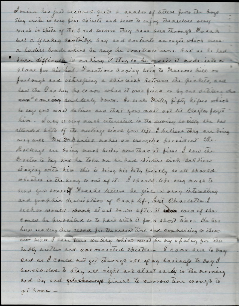 I have not heard from [brother] Charlie yet. I do not know whether his regiment is in the city or not. We have got a large balloon here in our camp. He went up yesterday to take a look at the rebels. He could look right down onto them & see what they were doing. After he had been up a little while, the rebels fired a cannon ball at him but they could not reach him. He had ropes fixed to a large tree so that he would not blow away. 6