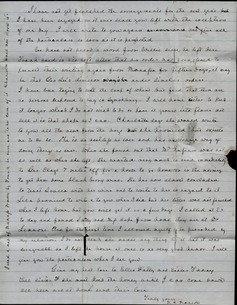 We have not heard a word from Willie since he left here. Frank said in his last letter than an order had been issued to prevent their writing again from Manassa for fifteen days. It may be that that Gen. Lee’s Division is under similar orders. I have been trying to sell the crop of wheat but find that there are no persons disposed to buy in Lynchburg. I will have either to keep it longer—which I do not wish to do—or have it ground into flour and sell it in that shape as I can. Charlotte says she would write to you all the news from the boys as she promised but she expects me to do so. She is as restless as ever and has a strange way of doing things as ever. When she found out that Mr. Rassam was not as well as when she left, she wanted very much to send immediately to Gen. Clags 7 miles off for a horse to go home on in the morning to get him some blackberry wine. She has now almost concluded to toast Louisa with her wine and to write to her in regard to it. Lila promised to write to you when I did but her letter was not finished when I left home. But you will get it in a few days.