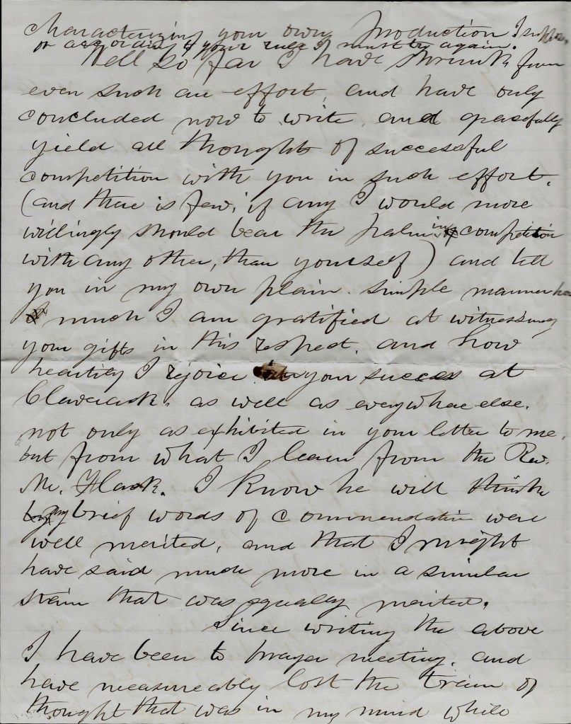 Your very acceptable, and to my poor comprehension, good letter of the 9th inst. which you pleased to characterize as a “miserable apology for a letter” measured of course by the standard of some of your own happiest efforts in that line, was duly received and it it was my intention to have answered it forthwith. But I did not immediately find time to undertake the writing of what I deemed a suitable answer to even the “miserable apology” (so termed by you) and in process of time, another more elaborate and finished production has made its appearance, the reading of portions of which fairly made my blood tingle in my veins and almost made me do as you say Gough’s lecture 1 did his hearers laugh and cry by turns, and yet I am expected (no, not expected, but only to try) to answer such a letter with somewhat of the ability characterizing your own production. I suppose, or according to your rule, I must try again. Well, so far I have shrunk from even such an effort and have only concluded now to write and gracefully yield all thoughts of successful competition with you in such effort (and there is few, if any, I would more willingly should bear the palm in competition with any others than yourself) and tell you in my own, plain, simple manner how much I am gratified at witnessing your gifts in this respect, and how heartily I rejoice in your success at Claverack as well as everywhere else, not only as exhibited in your letter to me, but from what I learn from the Rev. Mr. Flack. I know he will think my brief words of commendation were well merited and that I might have said much more in a similar strain that was equally merited.