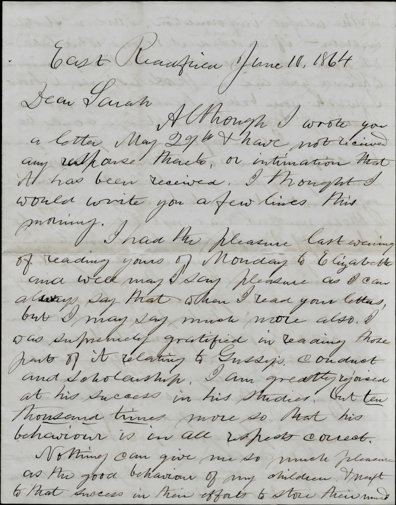 I had the pleasure last evening of reading yours of Monday to Elizabeth and well may I say pleasure as I can always say that when I read your letters, but I may say much more also. I was supremely gratified in reading those parts of it relating to Gussy’s conduct and scholarship. I am greatly rejoiced at his success in his studies but ten thousand times more so that his behavior is in all respects correct. Nothing can give me so much pleasure as the good behavior of my children & next to that success in their efforts to store their minds with useful information. And next still in order—if indeed it is is one whit behind—is your own success, or rather preeminence, wherever you are in those respects. Oh how I wish your bodily health was not so frail & that your lost eye could be restored. I am afraid in your eagerness to eclipse your competitors you will seriously injure your health or well eye. I entreat you to be careful in regard to those matters and not let any anxiety to bear off the palm, lead you to any exertion beyond what you can safely make as with ruined health, or the serious injury of your remaining eye, all the knowledge, much as it is to be prized, that you can possibly obtain, would be but a poor compensation.