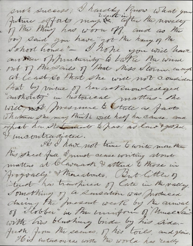 As I have not time to write more than this sheet full I must cease writing about matters at Claverack & attend to those in “Frog Valley” & thereabouts. But little of interest has transpired of late in the valley. Something of a sensation was produced during the present week by the arrival of “Slobber” in the uniform of “Uncle Sam” with his blushing bride by his side, fresh from the scenes of his toils and glories. His intercourse with the world has really done something in the way of removing his “slobberly” former appearance. I have had a glimpse at the woman & thought her quite decent looking. Henry Thomas has also arrived & in very good health. Lieut. Briggs is dead. He was mortally wounded in one of the recent fights. “Plaguey Slim” has also taken to himself a helpmate, or as “Od” Wing says, a “help-eat-meet.” Another important acquisition to the valley is the arrival of Frank Brainard.