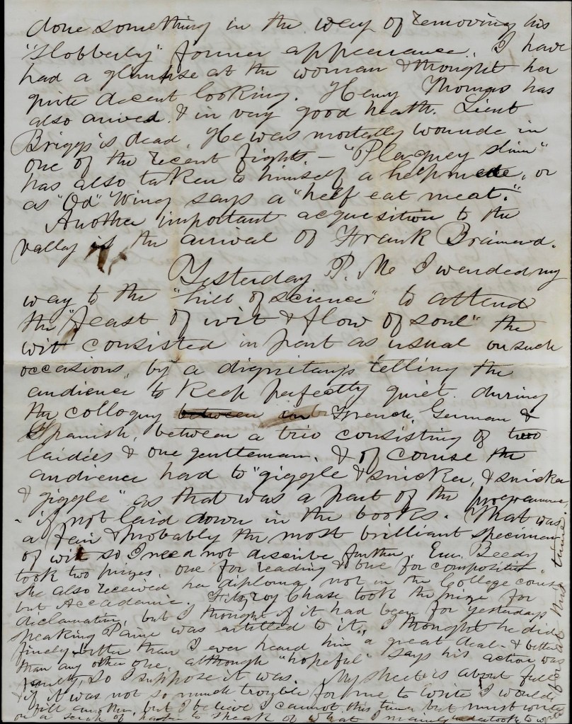 Yesterday p.m., I wended my way to the “hill of science” to attend the “feast of wit & flow of soul.” The wit consisted in part as usual in such occasions, by a dignitary’s telling the audience to keep perfectly quiet during the colloquy in French, German, and Spanish, between a trio consisting of ladies & one gentleman, & of course the audience had to “giggle and snicker, * snicker and giggle” as that was a part of the programme—if not laid down in the books. That was a few & probably the most brilliant specimen of wit so I need no describe further. E,. Beedy took two prizes—one for reading and one for composition. She also received her diploma not in the college course but academic. Fitzroy Chase took the prize for declamation but I thought if it had been for yesterday’s speaking, Paine was entitled to it. I thought he did finely and bettter than I ever heard him—a great deal & better than any other one, although “hopeful” says his action was faulty so I suppose it was. My sheet is about full and if it was not so much trouble for me to write, I would fill another but I believe I cannot this time but must write on a scrap of paper to speak of what I mainly took to write for at this time.