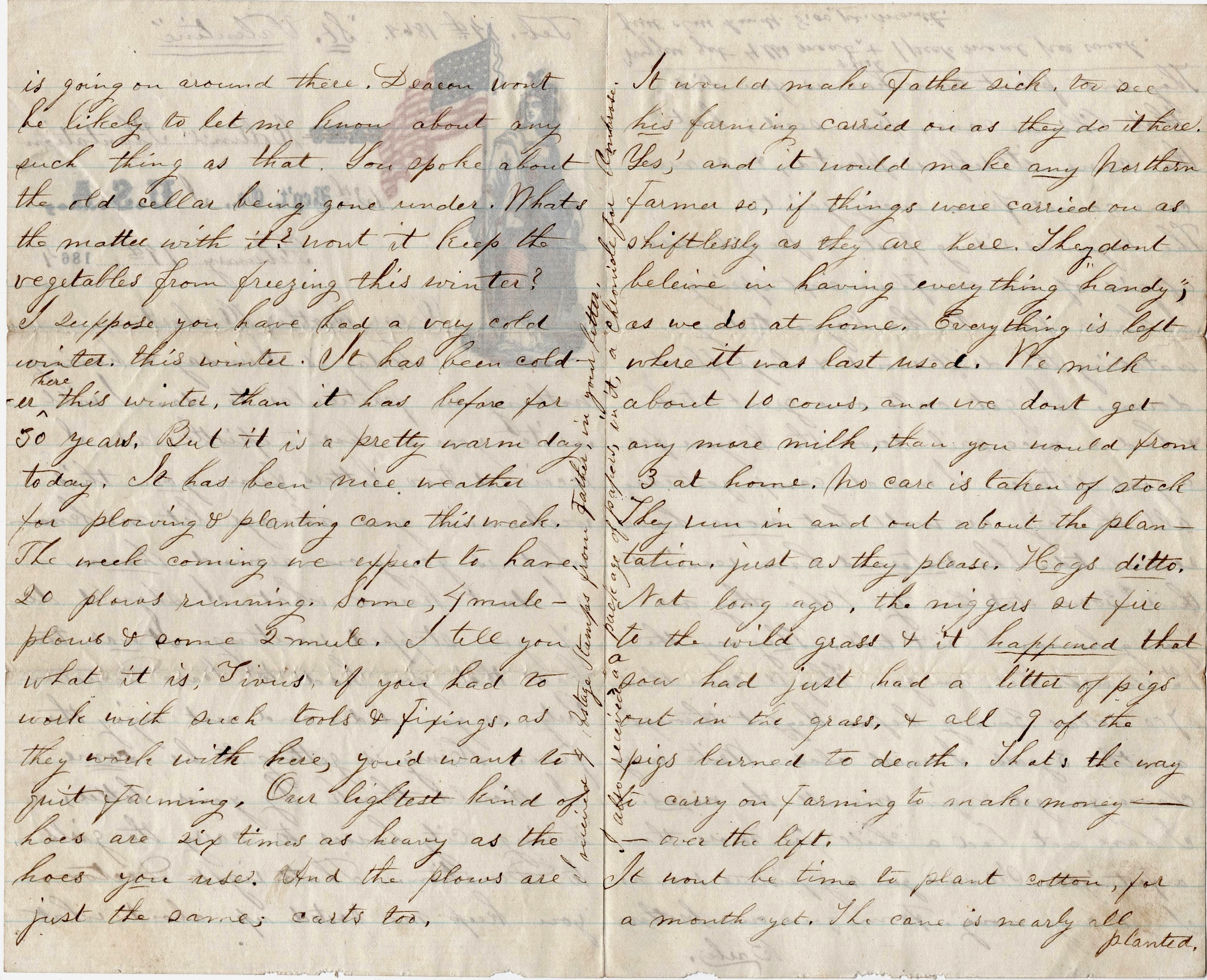 We milk about 10 cows and we don’t get any more milk than you would from three at home. No care is taken of stock. They run in and out about the plantation just as they please. Hogs ditto. Not long ago, the niggers set fire to the wild grass and it happened that a sow had just had a litter of pigs out in the grass & all 9 of the pigs burned to death. That’s the way to carry on farming to make money—-over the left.